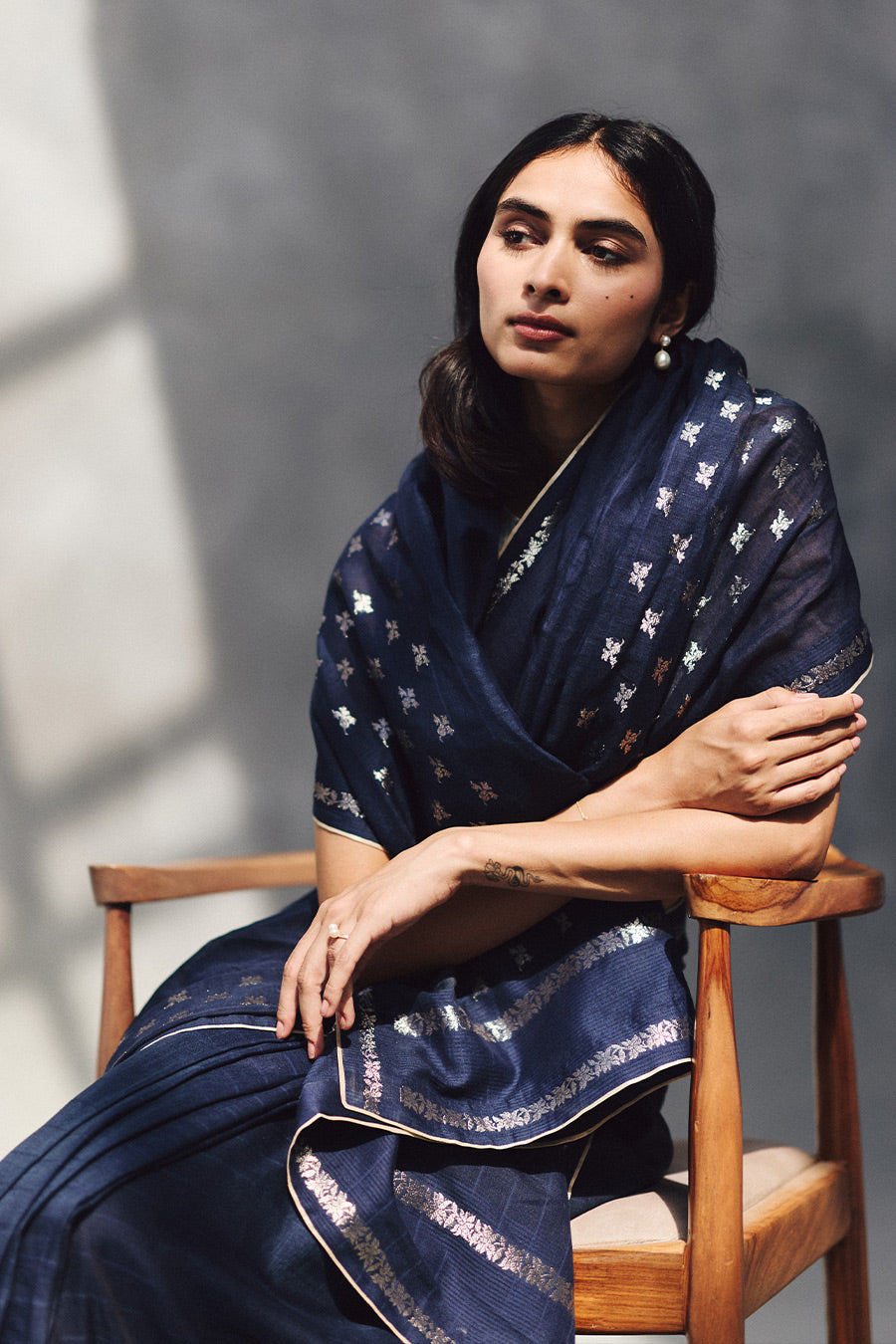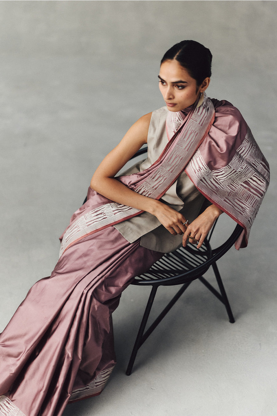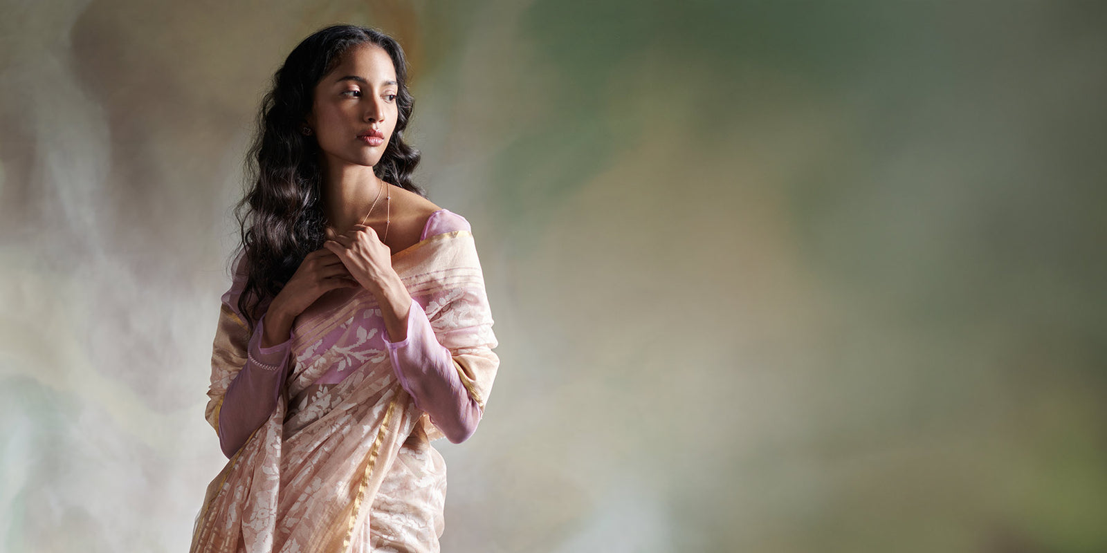 Bringing the earthy tactility of cotton-by-linen weaves in dialogue with Banarasi craftsmanship through a fresh palette.