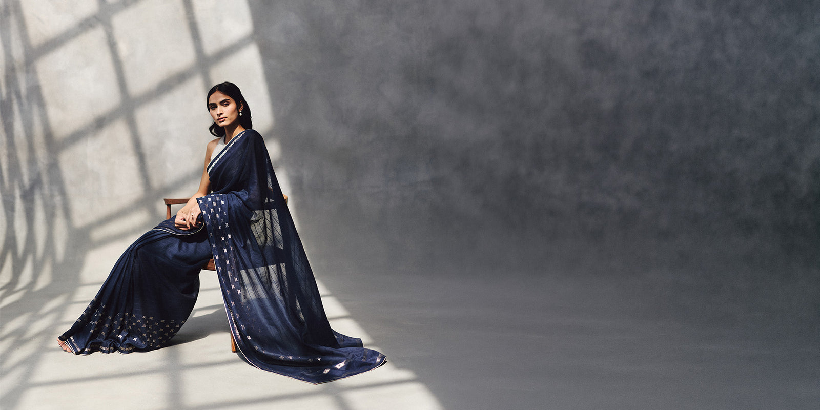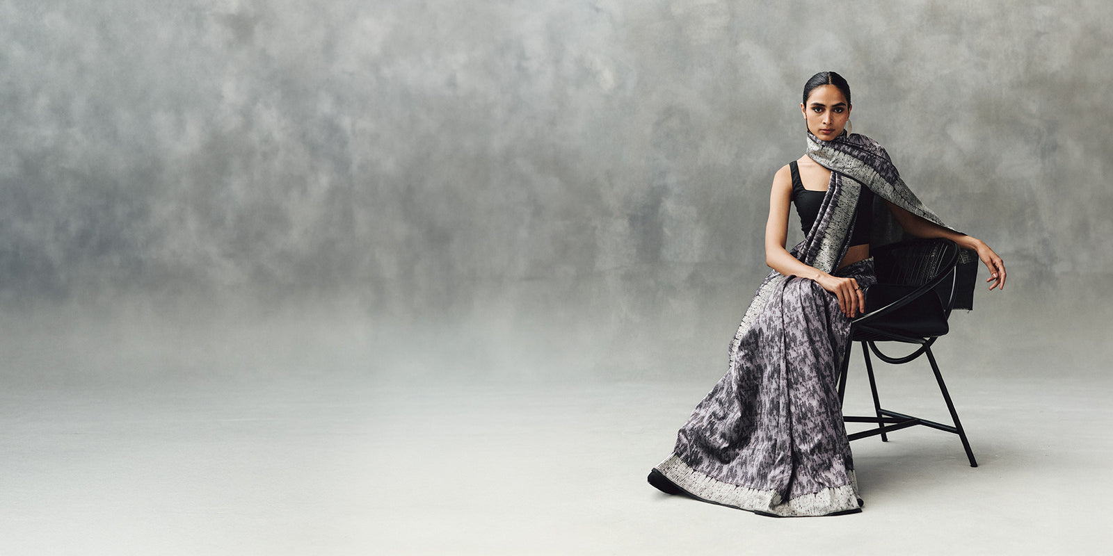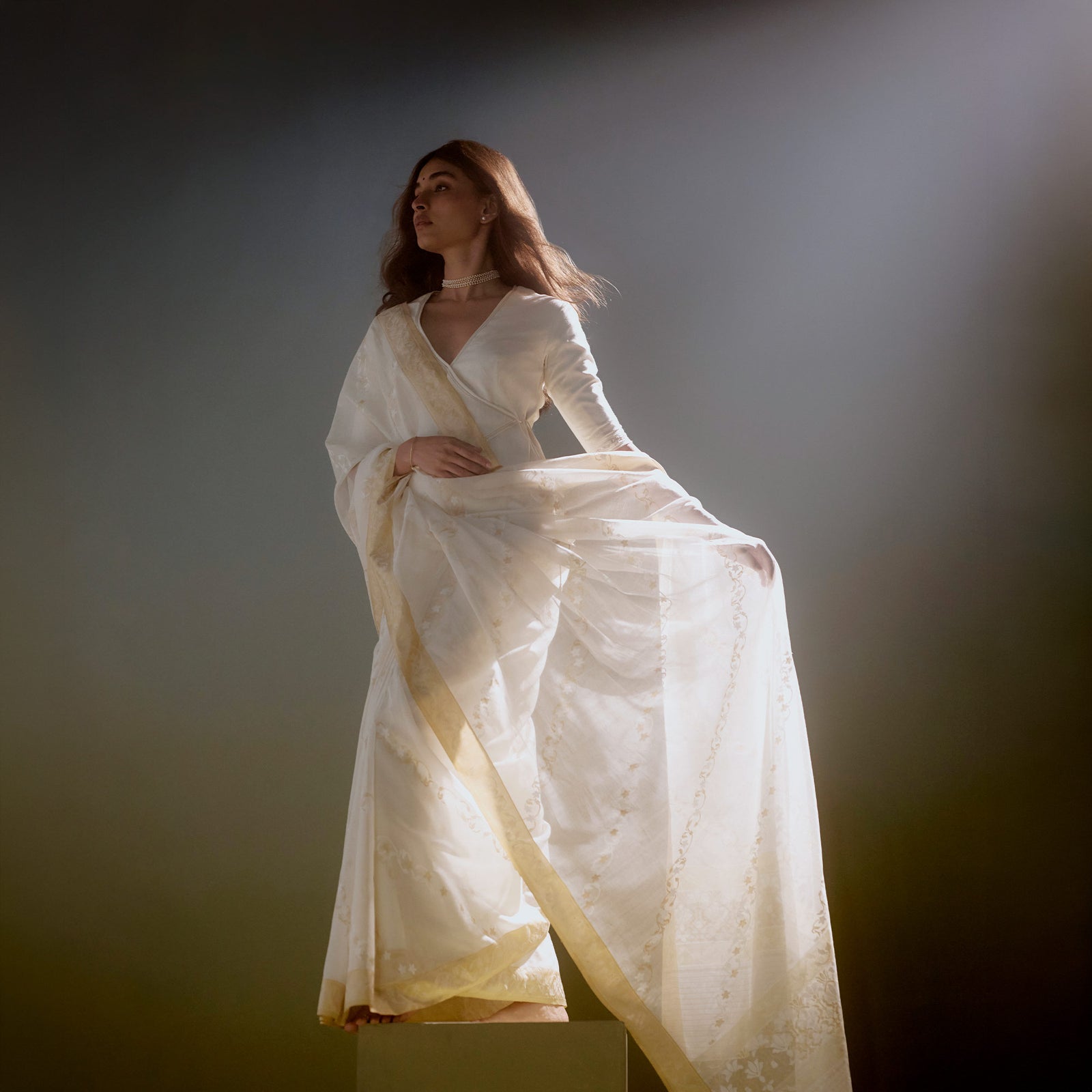 Bringing the earthy tactility of cotton-by-linen weaves in dialogue with Banarasi craftsmanship through a fresh palette.