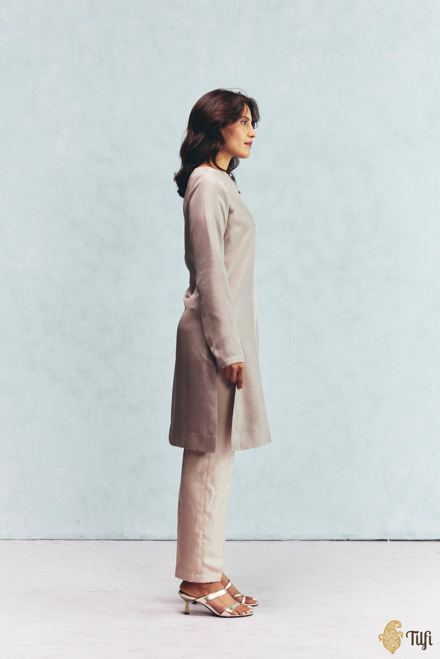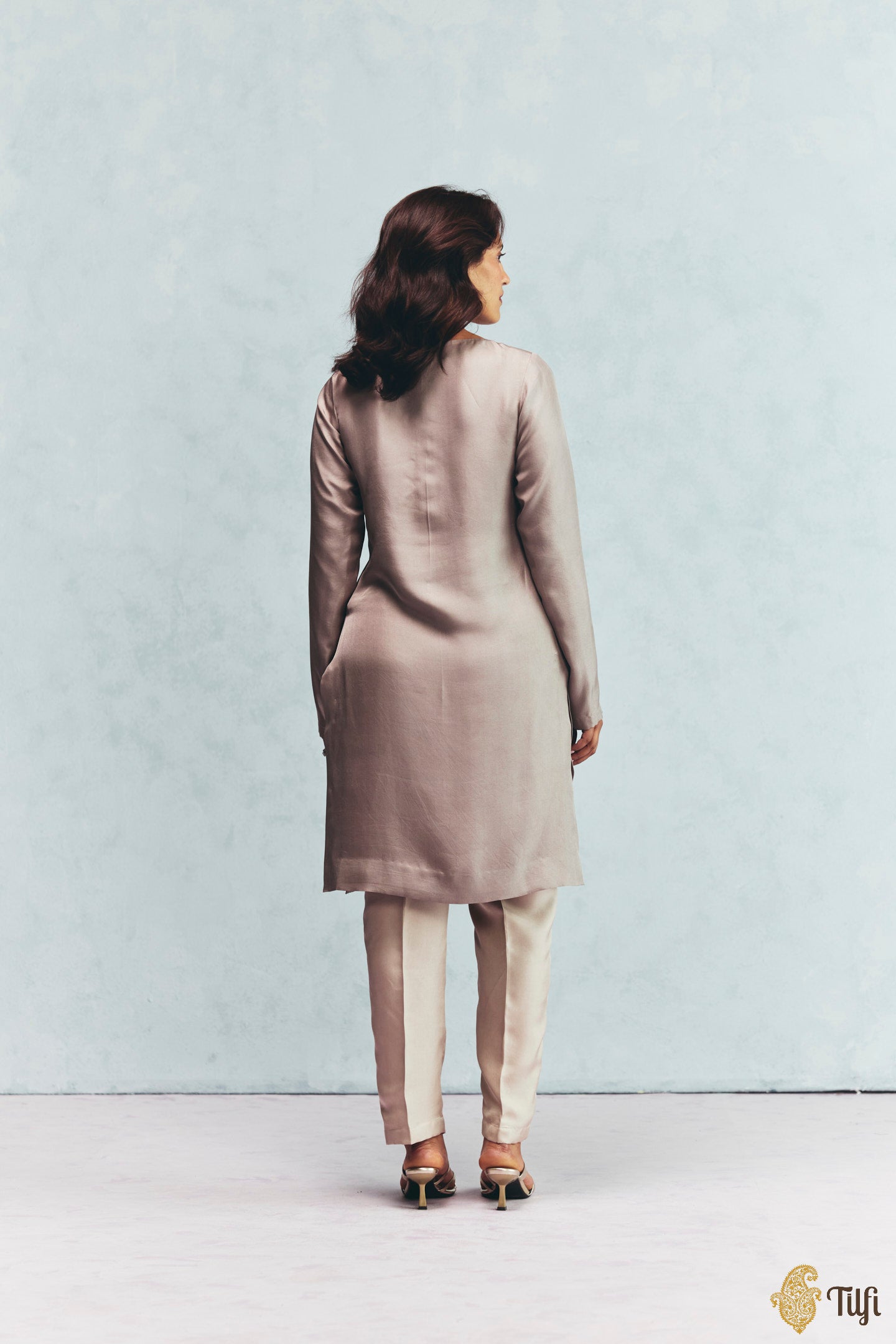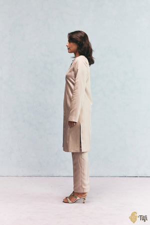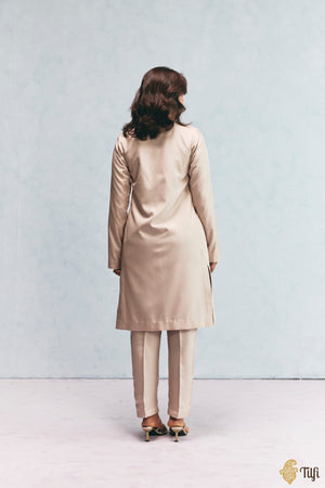 A minimal beige overlay-and-pant set paired with a mauve kurti. With zari hand-embroidered detailing on the neckline, it brings together finesse and warmth for an effortless and comfortable ensemble.
