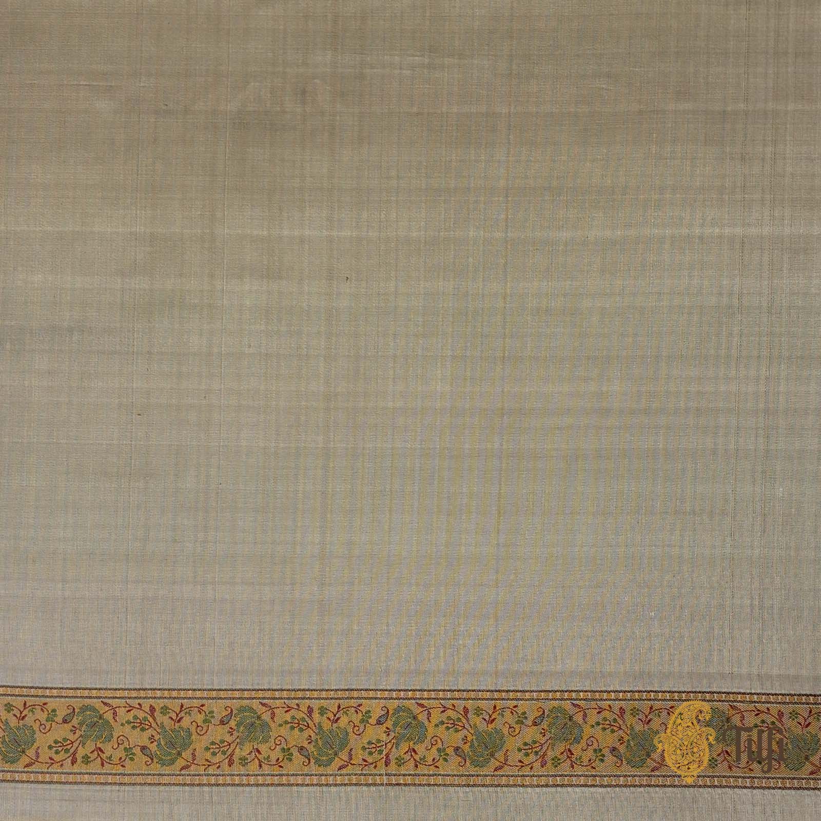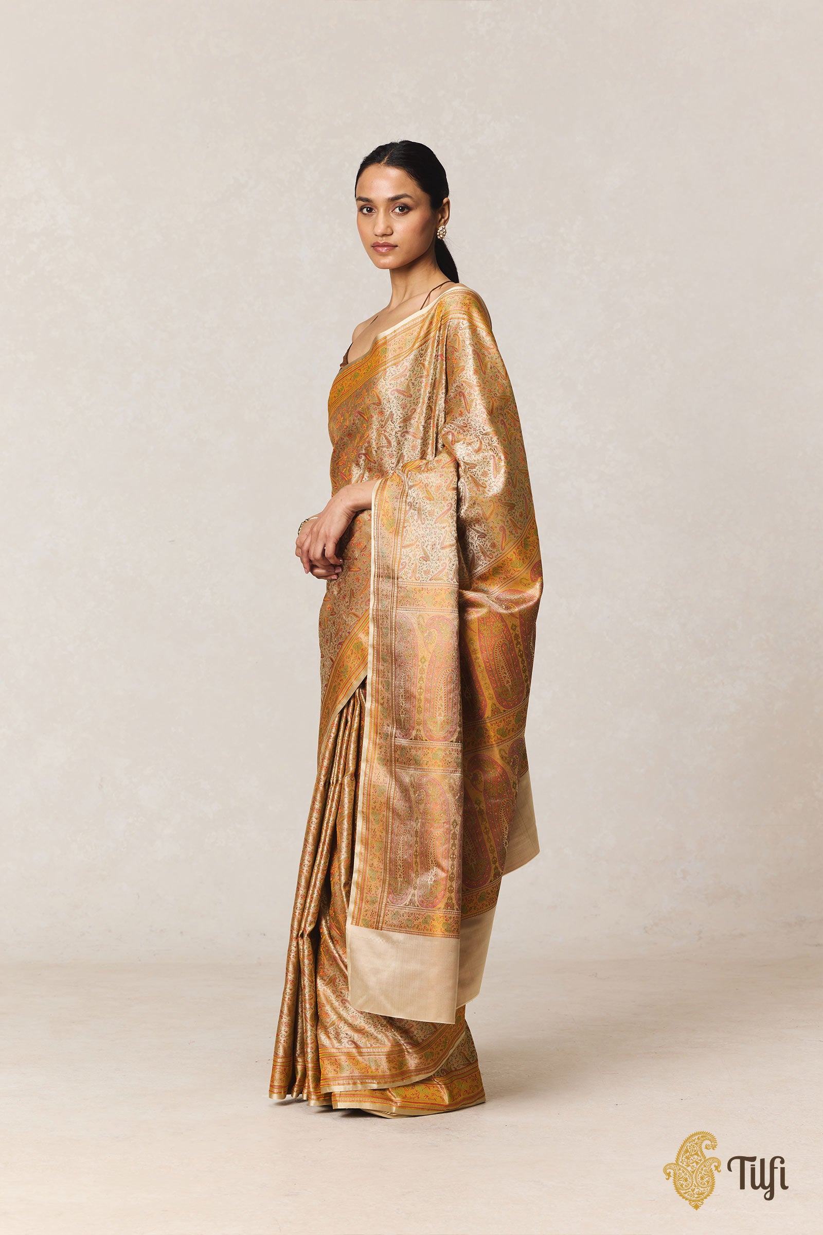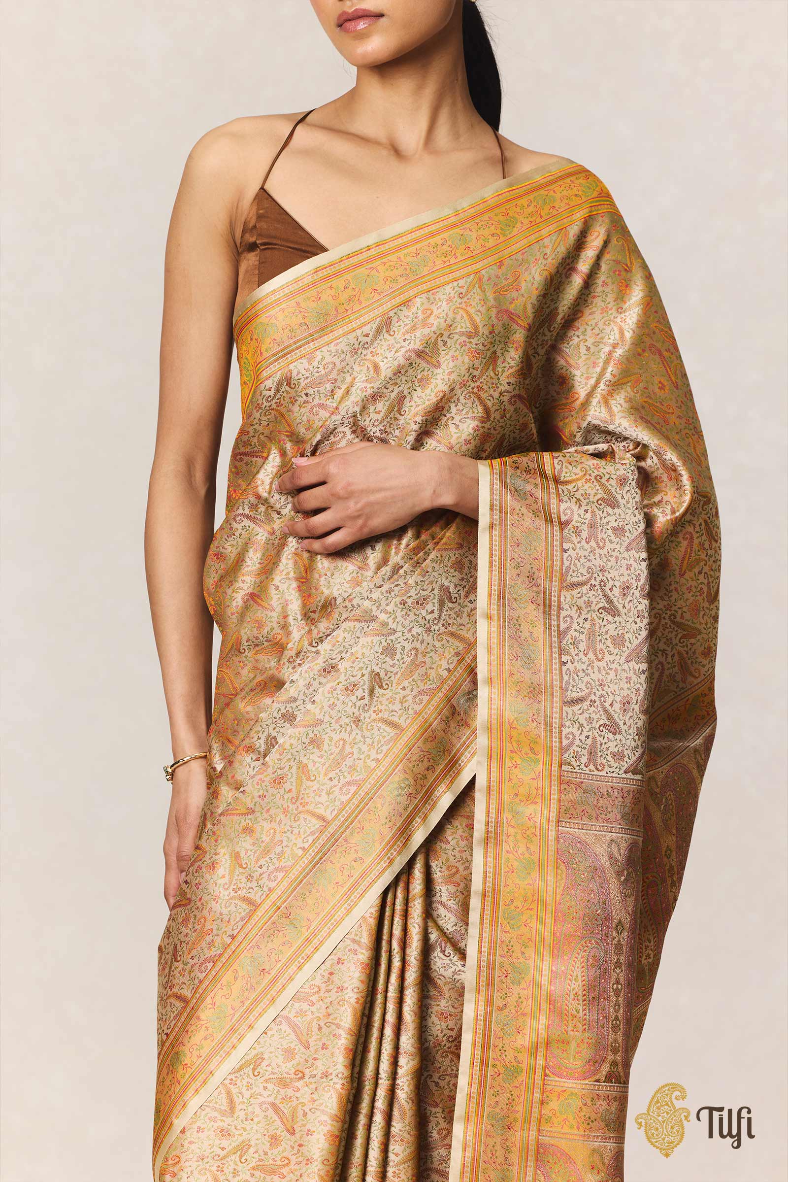 A beautiful labyrinth of paisleys, a celebration of Indian textile arts. Influenced and inspired by a Kashmiri design legacy, a Banarasi Tanchoi Jamawar is an enchanting and distinctive handloom saree.