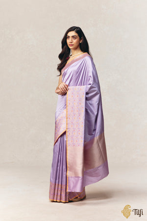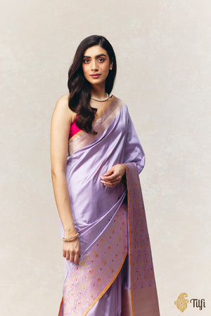 Technique - The finest Tanchoi weaving technique, which employs one or more warps and multiple coloured wefts to produce a self-design that covers the body of the saree. Meenakari involves the painstaking addition of supplementary coloured resham threads during the hand-weaving process.