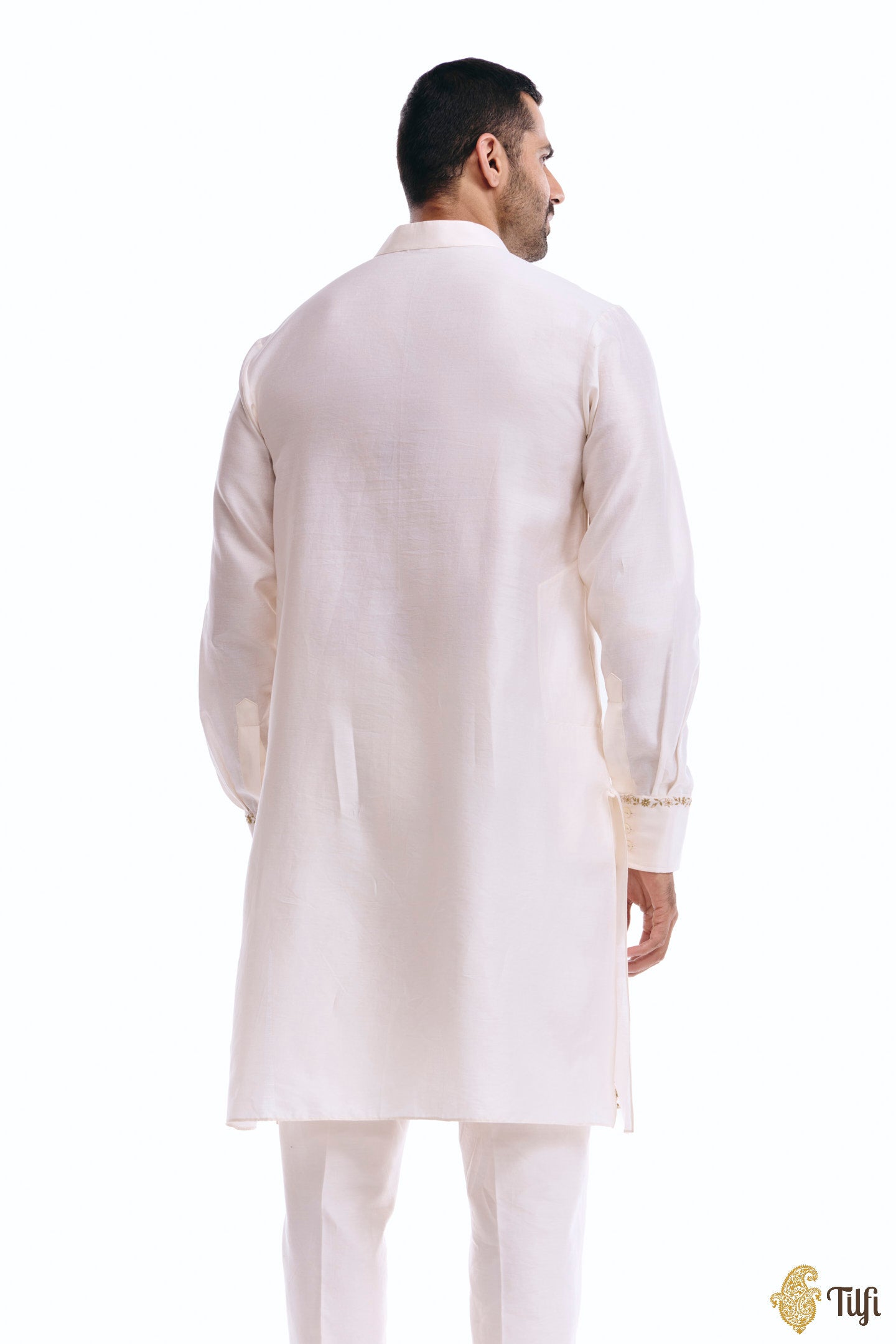 A classic off-white kurta set crafted in elegant silk cotton, featuring hand-embroidered zari and resham detailing. Pintuck accents add an elegant touch and structured grace to the kurta.