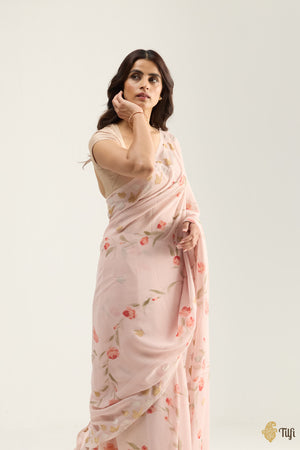 A gentle reverie captured in silk. This diaphanous Georgette saree is handpainted with delicate floral motifs - each stroke echoing the fluid grace of the fabric. Along its borders, zari-lined butterflies offer a subtle shimmer to this dreamline composition of art and weave.