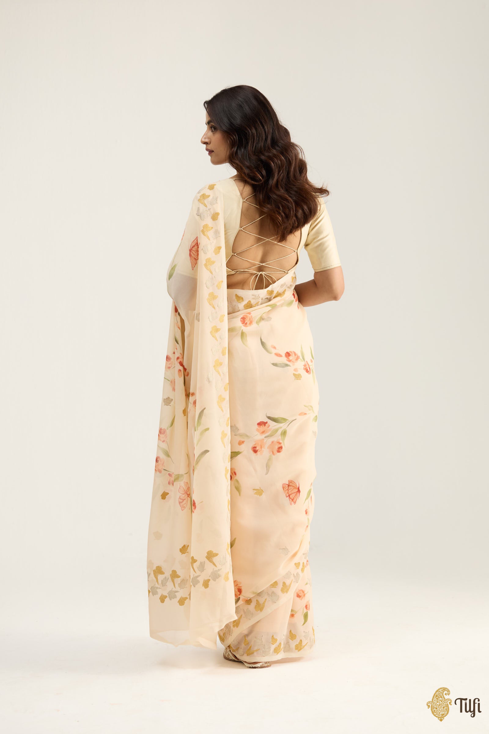 A gentle reverie captured in silk. This diaphanous Georgette saree is handpainted with delicare floral motifs - each stroke echoing the fluid grace of the fabric. Along its borders, zari-lined butterflies offer a subtle shimmer to this dreamlike composition of art and weave.