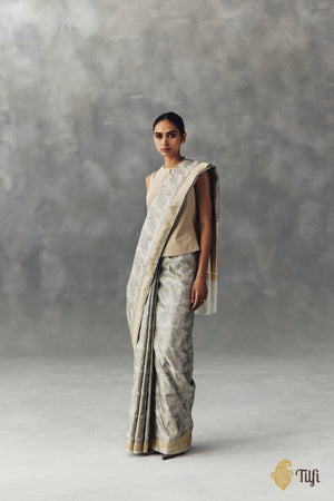 Inspired by the art of camouflage witnessed in nature, our Sunayana saree employs the Tanchoi weave in unexpected ways. Breaking free from the traditional regularity of pattern placements in Banarasi weaves, Sunayana plays with strokes and colours with a whimsical dose of zari for a handwoven modern classic.