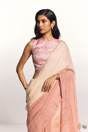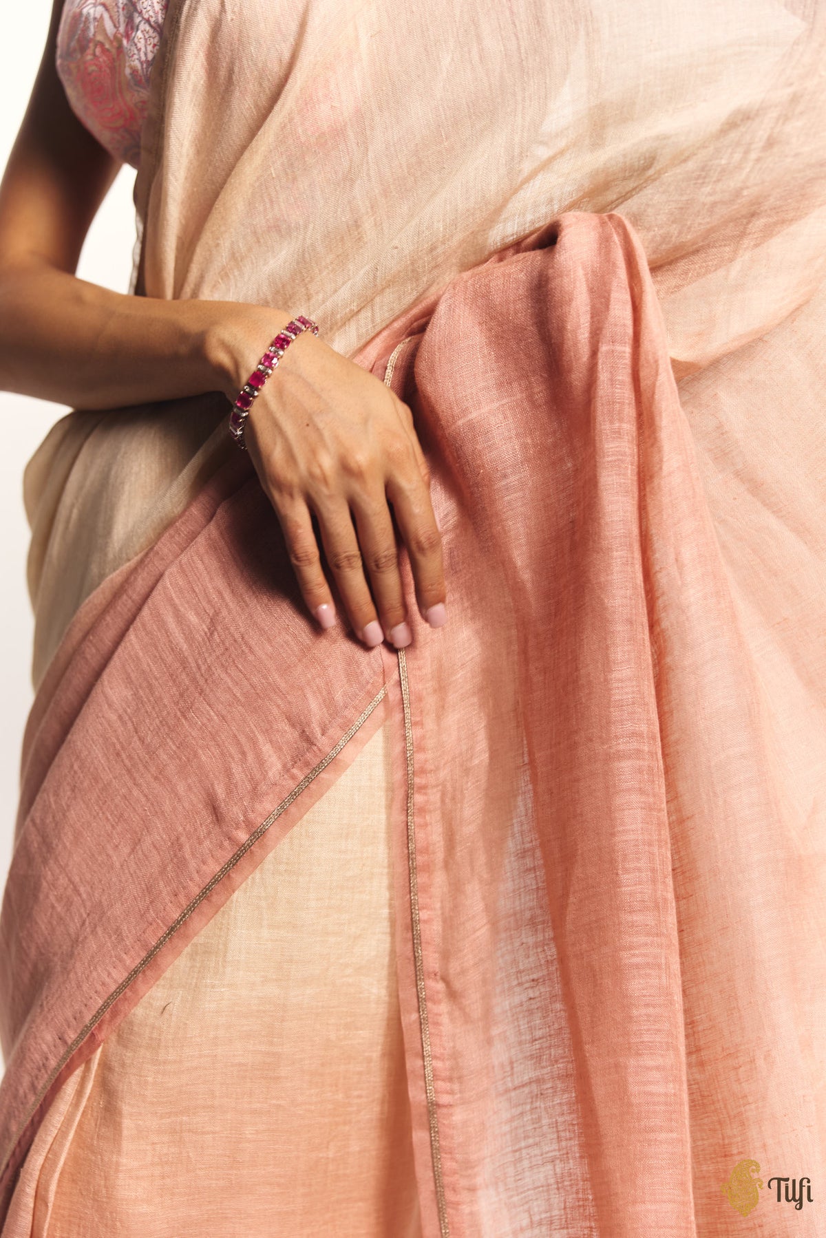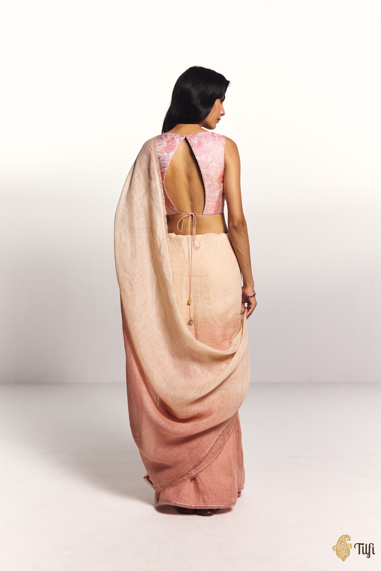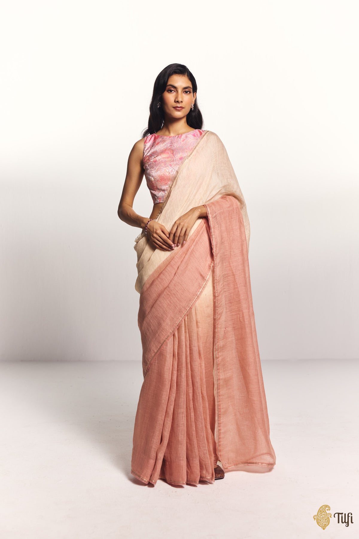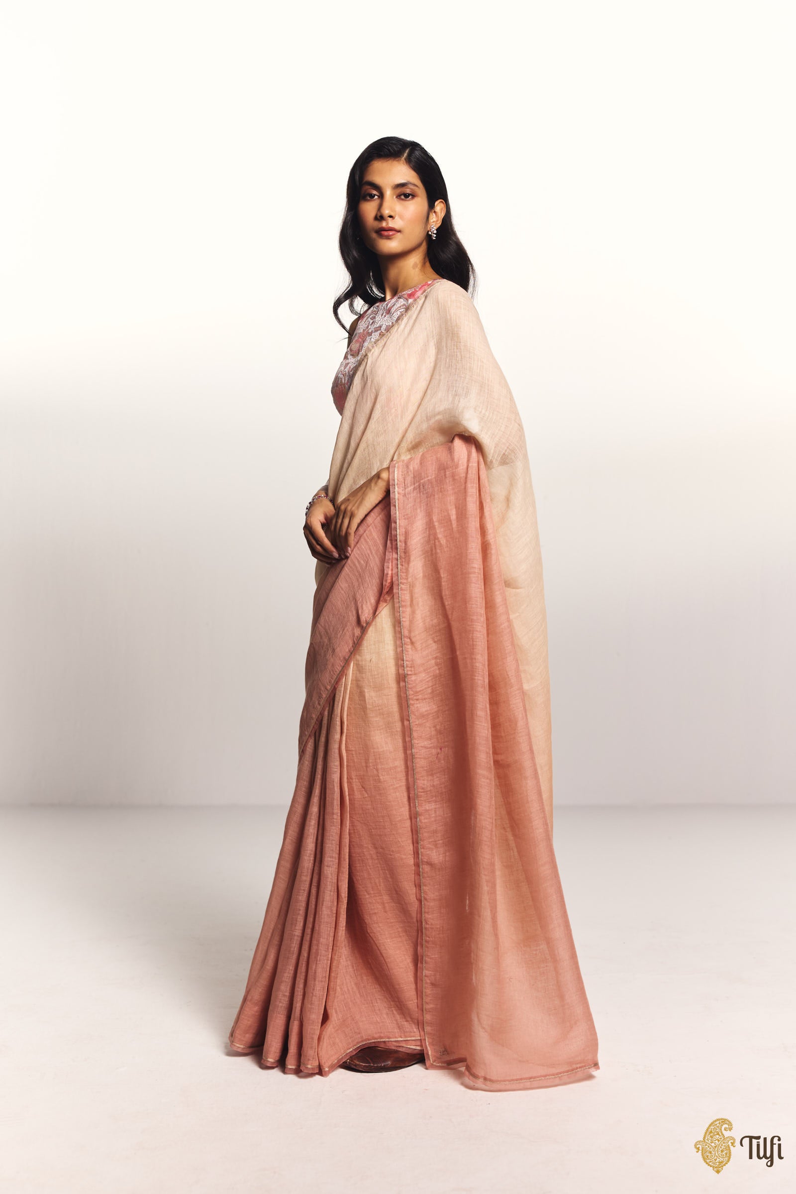 A serene essential in Tilfi’s textile vocabulary. Handwoven from the finest linen yarns and dyed in gentle ombré hues, this saree embodies the beauty of restraint. Unfussy yet distinct, it features a whisper-thin zari and organza edging, and a single hand-embroidered Tilfi paisley—a quiet signature of craft nestled at the corner.