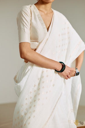 Collection Note - Intersections brings the earthy tactility of cotton-by-linen weaves into dialogue with the language of Banarasi craftsmanship. Stripes, checks, and floral accents emerge with a softened edge, the natural diffusion of linen’s texture tempering the precision of the master weaver’s hand. Tension is finely calibrated to the fibre’s inelastic nature, reed settings adapted to maintain clean patterning, and zari with meenakari is worked in the slow, exacting kadhua technique. Each saree is a study in intersections: of fibre and form, restraint and ornament, personality and pattern.