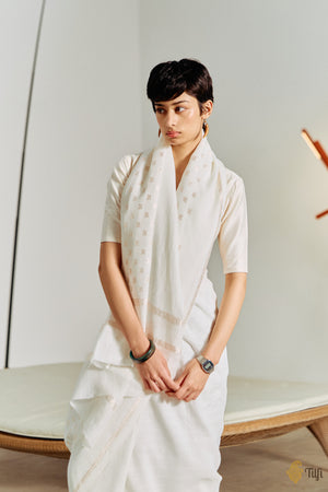 Like Sher-Gil’s bold, horizon-spanning compositions, Amrita balances expanses of calm with moments of intricate detail. The body’s measured horizontal lines evoke architectural poise, while the kadhua zari florets and borders lend weight and shimmer to the saree’s grounded geometry. A weave for those who carry both structure and softness in equal measure.