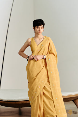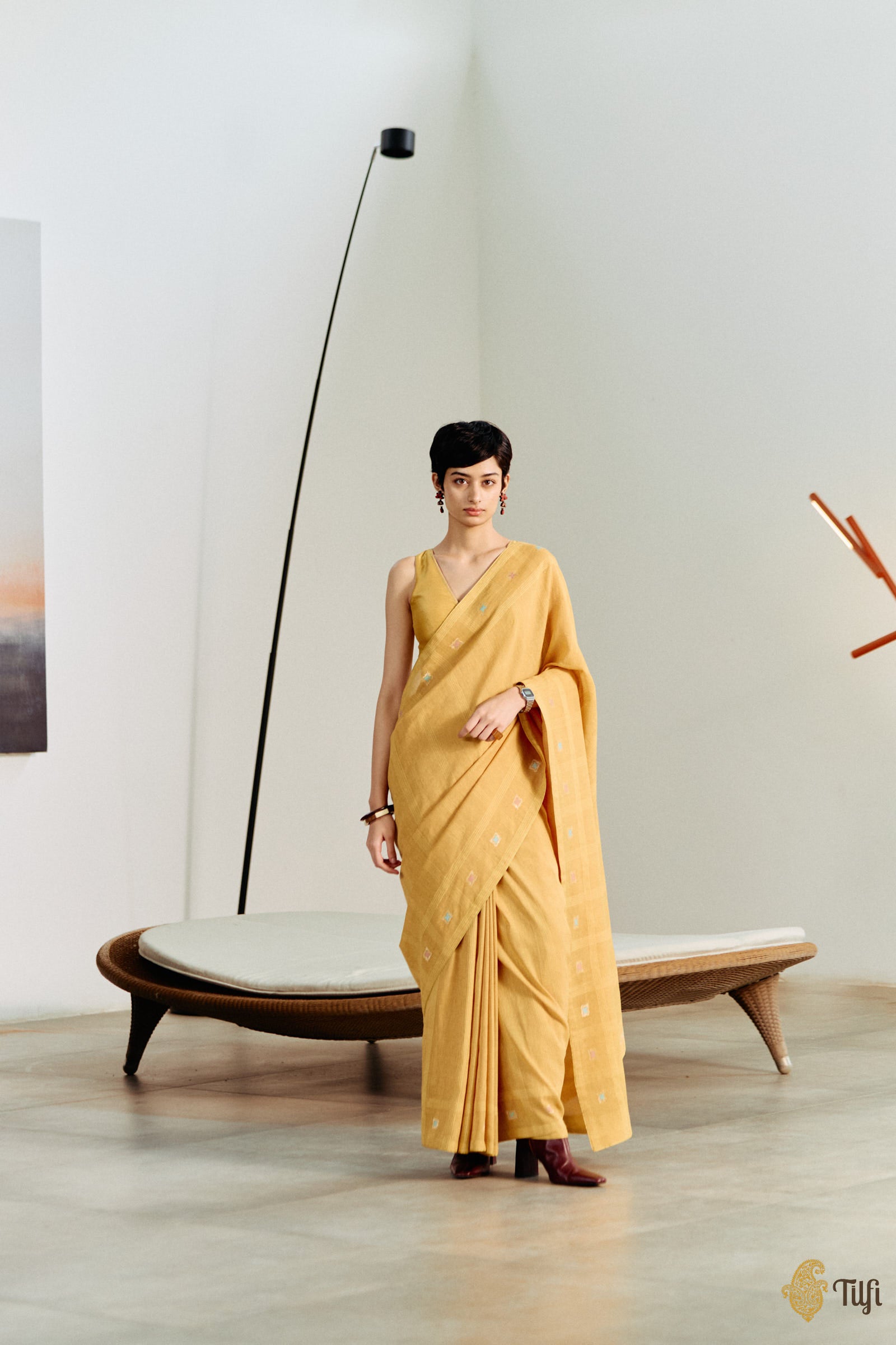 Collection Note - Intersections brings the earthy tactility of cotton-by-linen weaves into dialogue with the language of Banarasi craftsmanship. Stripes, checks, and floral accents emerge with a softened edge, the natural diffusion of linen’s texture tempering the precision of the master weaver’s hand. Tension is finely calibrated to the fibre’s inelastic nature, reed settings adapted to maintain clean patterning, and zari with meenakari is worked in the slow, exacting kadhua technique. Each saree is a study in intersections: of fibre and form, restraint and ornament, personality and pattern.