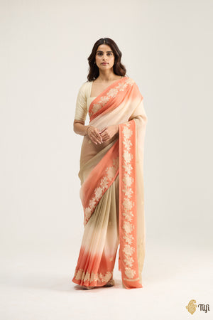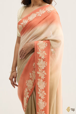 A mesmerising melange of colour and form, this Georgette saree is hand-dyed in radiant ombré hues. Adorned with delicate motifs and framed by shimmering zari, it is a captivating composition of modern vibrance and timeless artistry.