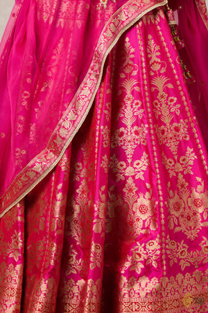 Speciality - This beautiful lehenga is handwoven in classic light gold zari with delicate meenakari detailing in Red. The odhani features beautiful handwoven borders and painstaking aari hand-embroidery across its borders and bootis. Completed with a lustrous satin blouse with dainty hand-embroidery and a flattering silhouette.