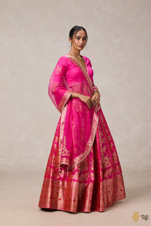 An exquisite handloom lehenga in a festive combination of hues. A labour of love, encapsulating centuries of weaving traditions and months of painstaking craftsmanship. On your special day, wrap yourself in these yards of our heritage.