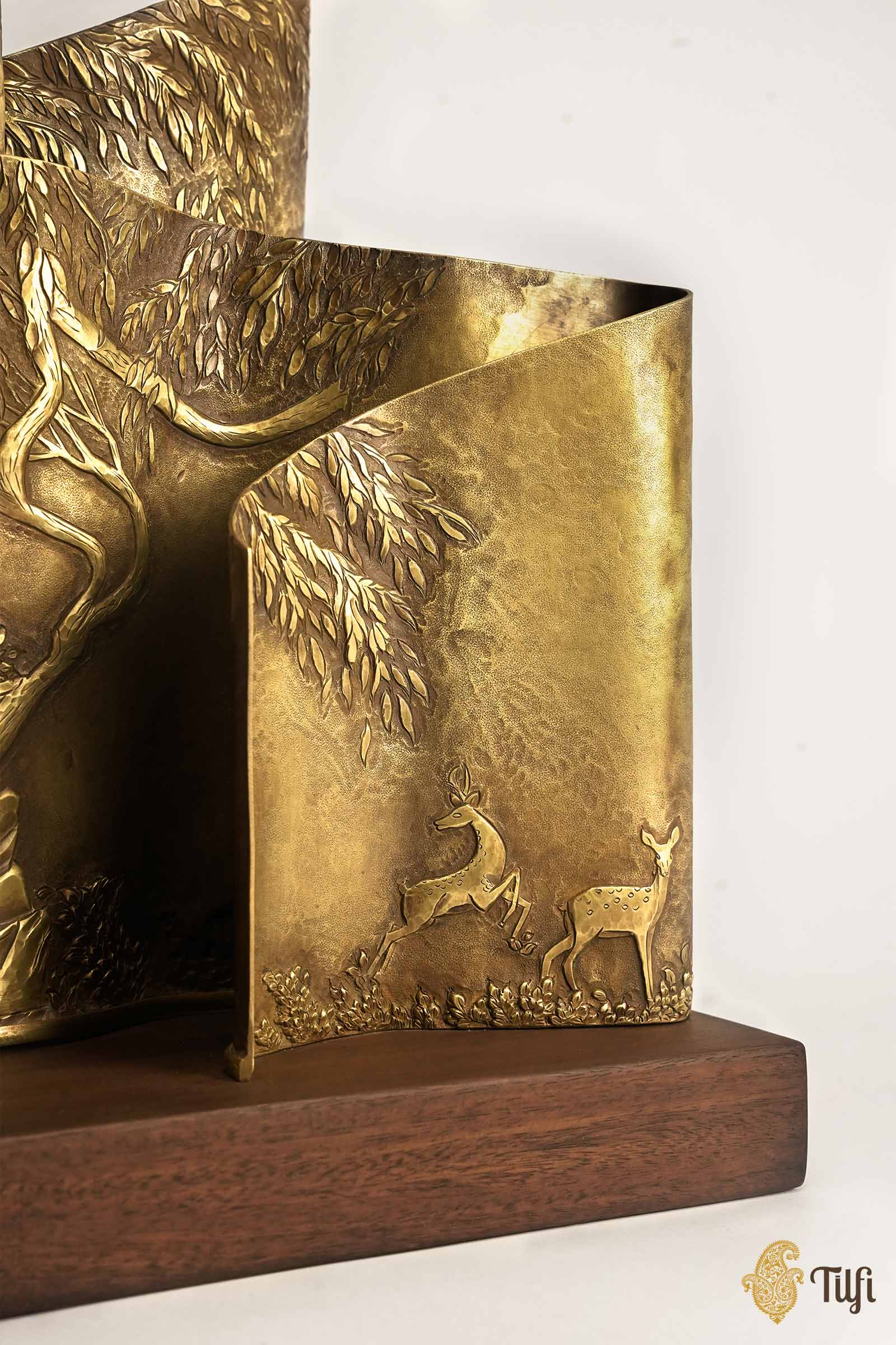 The From Dusk Lamp balances narrative metalwork with a restrained, architectural form. Its curved brass base is worked in repoussé with a dense tree canopy, deer in motion, and a solitary figure set within a layered junglescape.