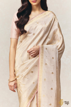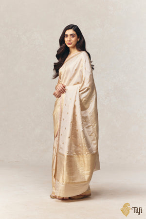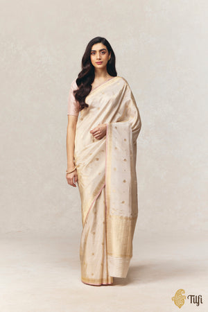 A study in restraint and radiance, this off-white Pure Katan by Tissue saree embodies Banaras at its most refined. The fabric carries a soft luminosity and is unmistakably regal. The saree features finely spaced Kadwa Roopa Sona bootis, individually handwoven using the traditional kadwa technique in silver and gold zari.
