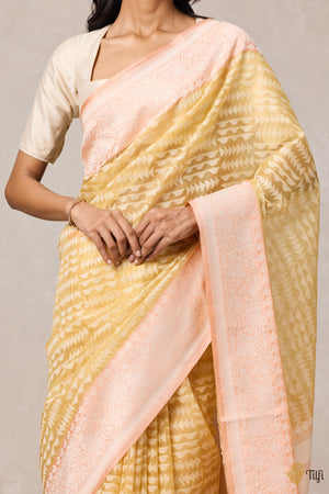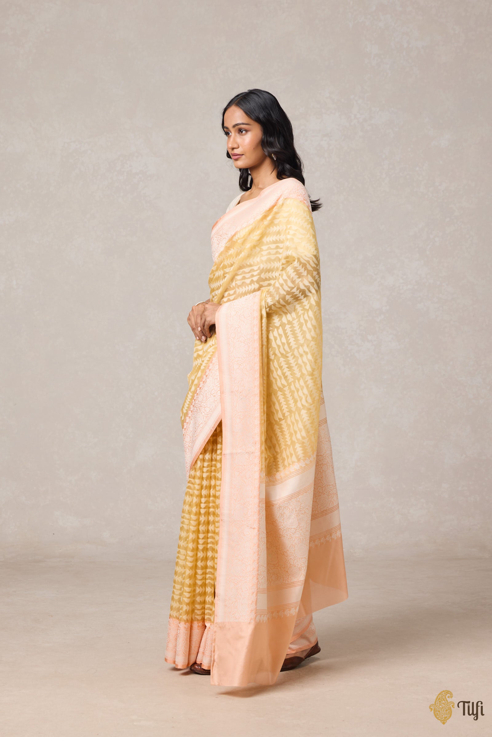Pre-Order: Pale Yellow-Peach Pure Kora Silk Banarasi Handloom Saree