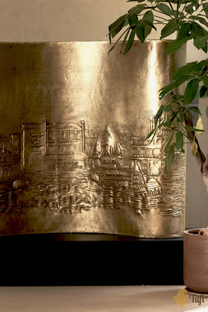 A masterful tribute to Banaras, this repoussé artwork brings together two inseparable legacies—the storied architecture of its ghats and the intricate artistry of its textiles. Etched onto an undulated metal surface, the ghat reveals itself with topographical precision, showcasing the façades and intricate details of the city's historic riverfront. Nestled within the composition, hallmark Banarasi textile motifs reveal themselves in quiet intricacies, seamlessly interwoven with the architectural landscape. A peacock, symbolizing the grandeur of shikargah designs, stands poised amidst the scenery, while a classic koniya motif anchors the composition with its timeless presence. This interplay of textile and architecture, rendered in metal, reflects their deep-rooted coexistence—an unbroken dialogue between craft, history, and landscape.