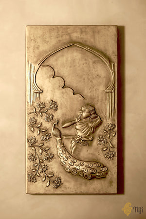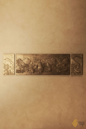 Three consecutive metal repoussé panels bring to life Kalidasa's 'Meghdoota', a timeless ode to longing and devotion. Crafted with intricate detail, the artwork narrates the tale of the exiled yaksha who implores a passing cloud to deliver his message of love to his distant wife.