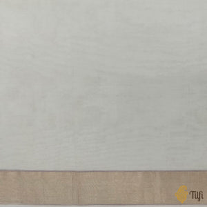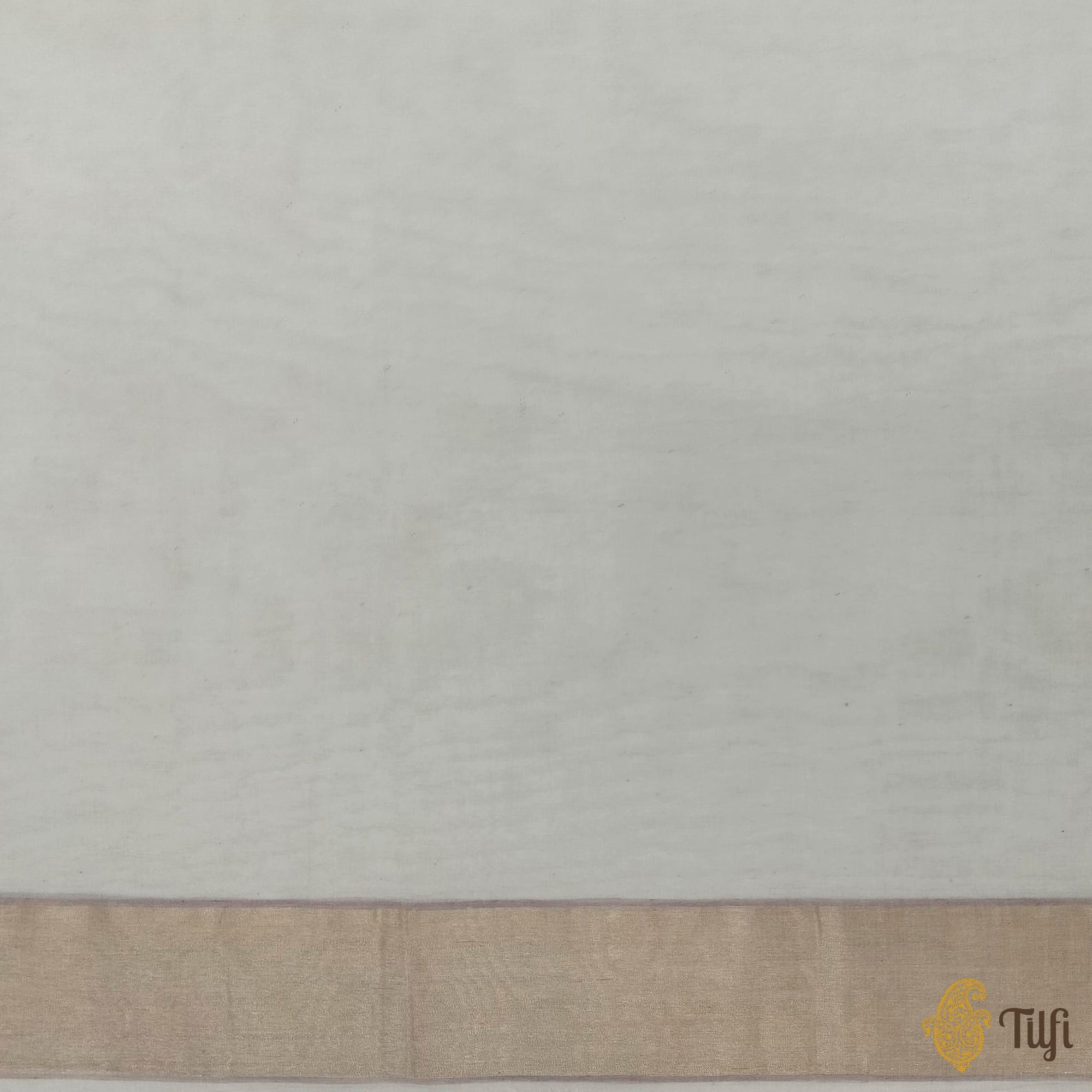 A finely woven Awadhi jamdani saree in pristine white where geometric shapes form an interconnected jaal, softened by delicate lotuses entwined within. Adorned with precise geometric detailing, it mirrors the measured symmetry of Mughal screens, balanced with a real zari border in gold - intricate yet weightless.
