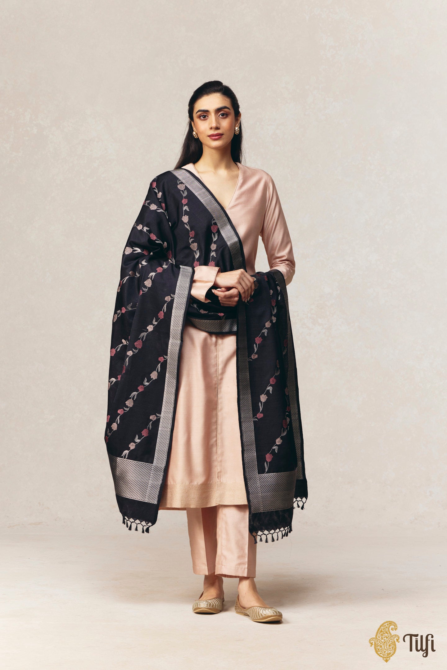 Alluring original Banarasi sarees, dupattas, lehengas, suits, blouses, and fabrics in black. Handwoven artistry in pure natural katan silk, georgette, tussar, cotton, and kora-organza fabrics.