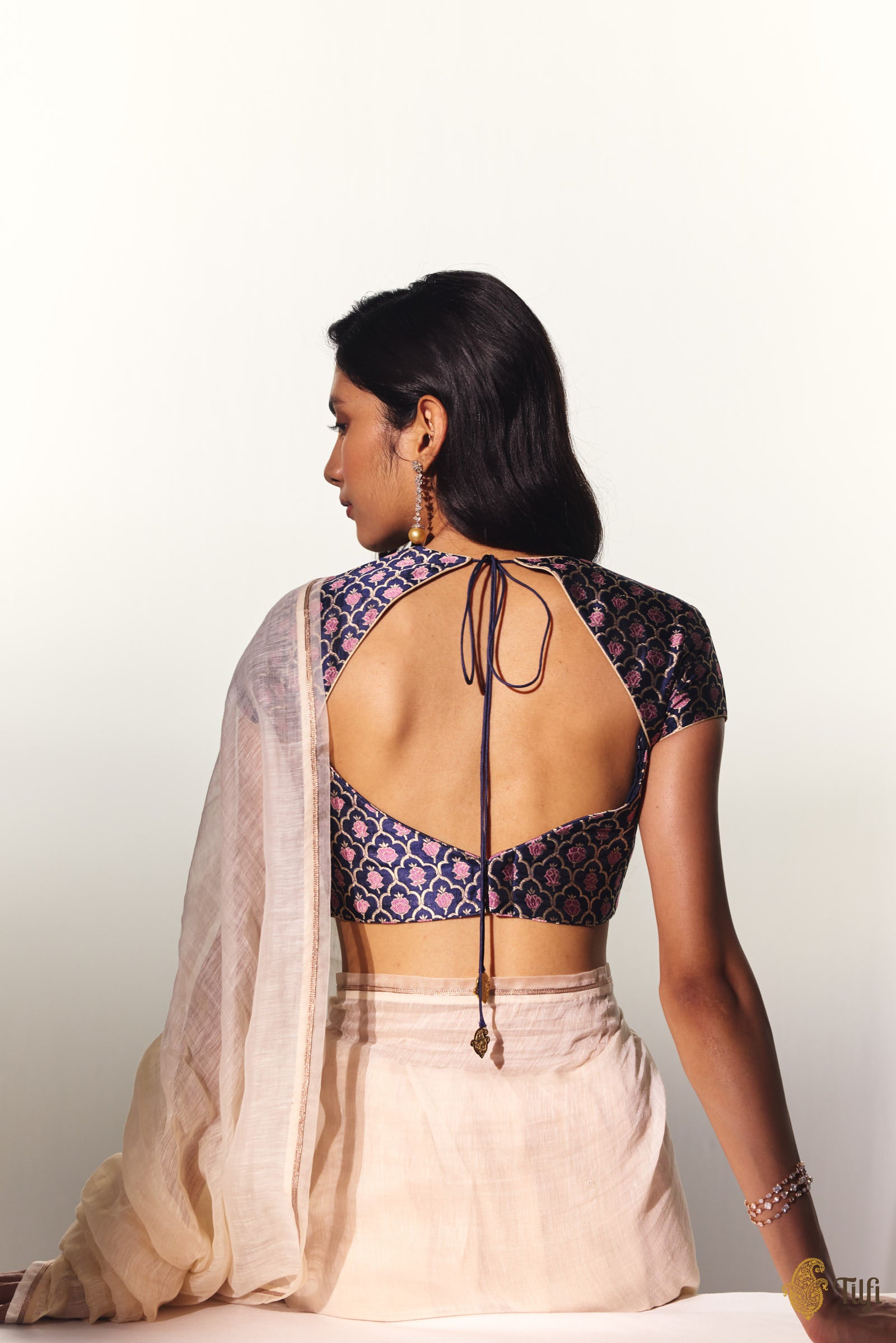 A statement saree accent, made using a beautifully handwoven meenakari brocade with a tessellated mughal jaali pattern and blooming florals. Featuring cap sleeves, a Queen Anne neckline, edged with tissue, and a high yet open back secured with hooks and a dori tie.
