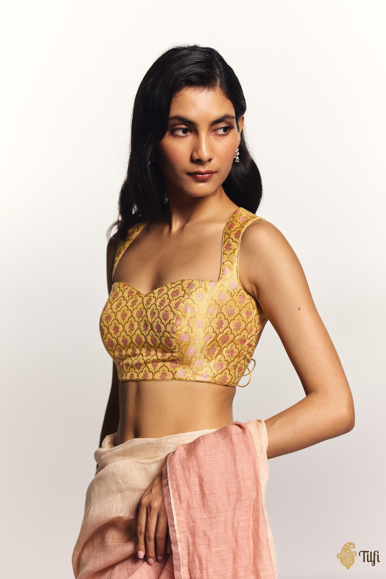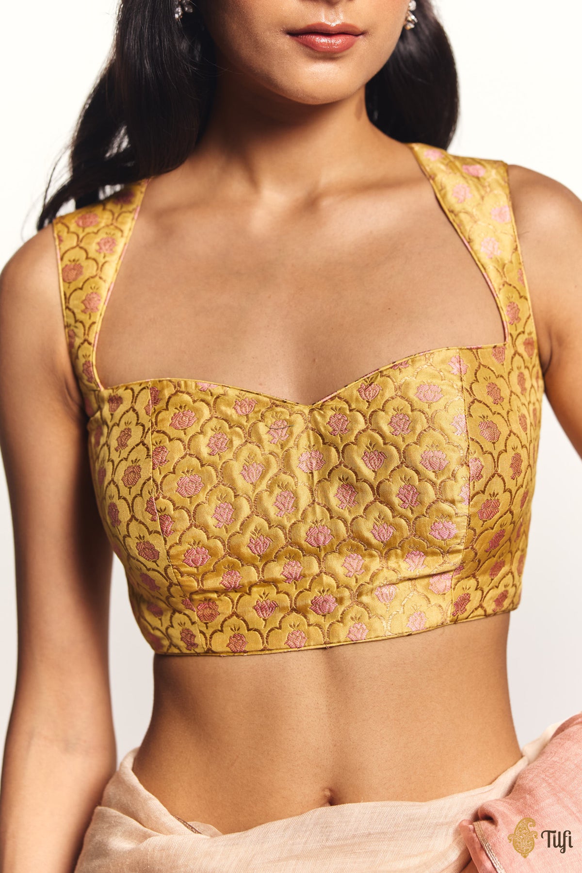 A statement saree accent, made using a beautifully handwoven meenakari brocade with a tessellated mughal jaali pattern and blooming florals. Featuring a feminine sweetheart neckline and flattering back secured with a hook and a tie.