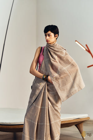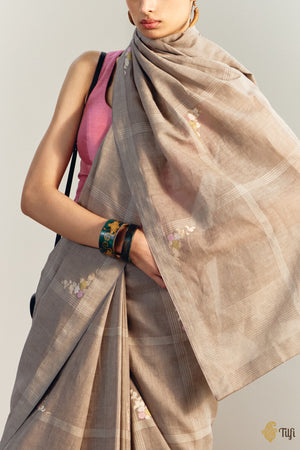 Collection Note - Intersections brings the earthy tactility of cotton-by-linen weaves into dialogue with the language of Banarasi craftsmanship. Stripes, checks, and floral accents emerge with a softened edge, the natural diffusion of linen’s texture tempering the precision of the master weaver’s hand. Tension is finely calibrated to the fibre’s inelastic nature, reed settings adapted to maintain clean patterning, and zari with meenakari is worked in the slow, exacting kadhua technique. Each saree is a study in intersections: of fibre and form, restraint and ornament, personality and pattern.