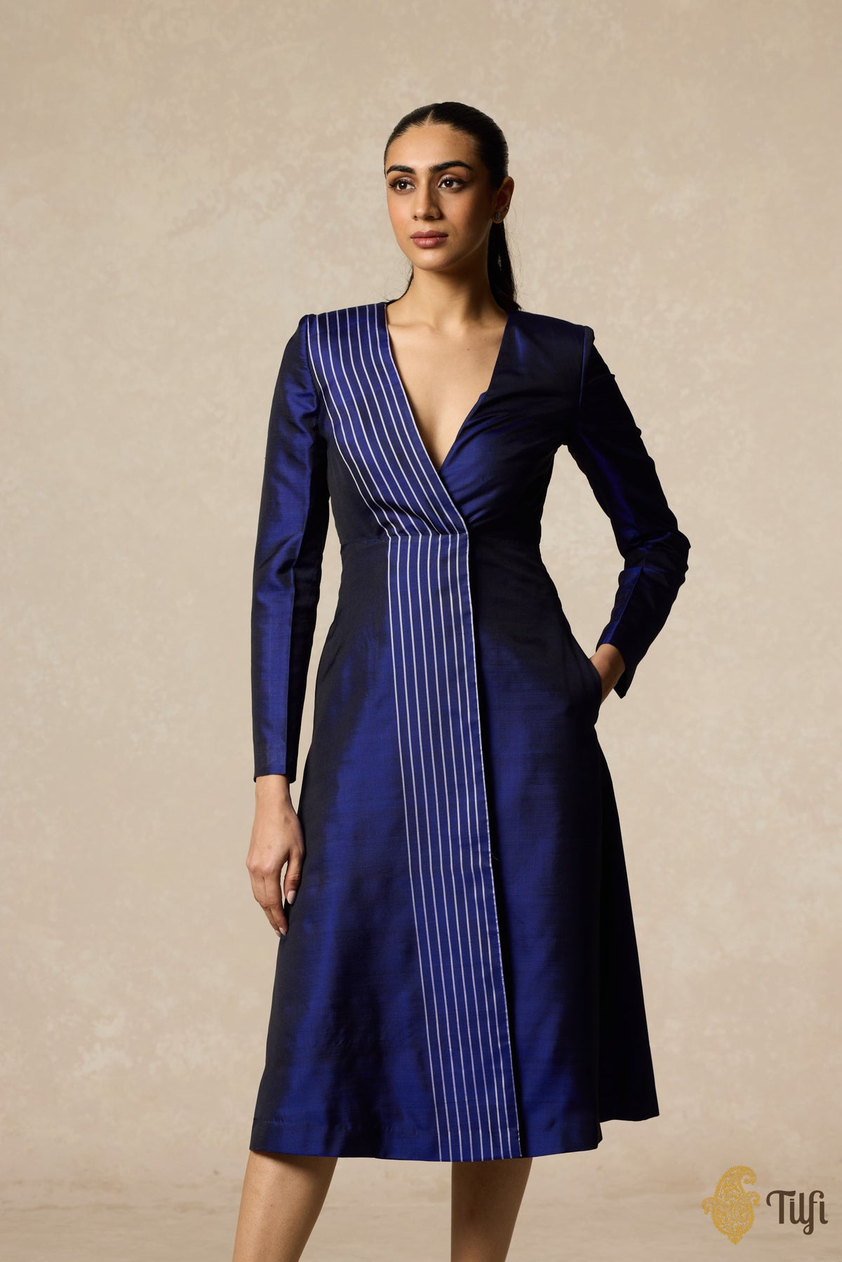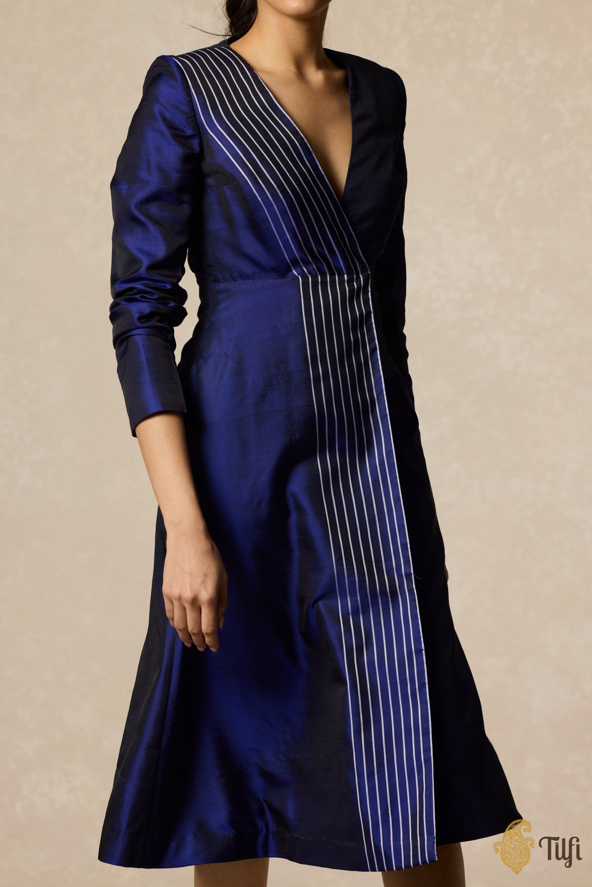Blue Handwoven Pure Silk Twill Wrap Dress