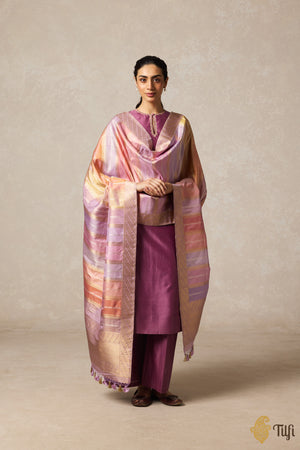 Timeless, elegant, and inherently festive— this rangkat dupatta glimmers with the quiet brilliance of roopa sona zari in stripes of delicate floral bootis. The pattern is neatly framed with a rich gold border and an opulent aanchal. Finished with delicate tassels, this is a striking and versatile addition to your festive wardrobe.