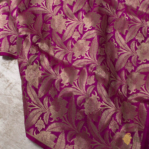 Indulgent and timeless zari work merged with delightful floral vines. Adorned with a beautiful zari jaal and the brightest of shades, this Banarasi fabric will sweep you away.