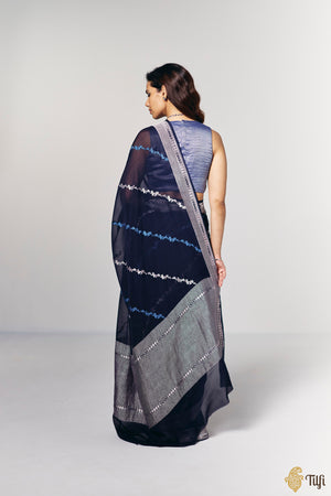 Tracing the rhythm of night, this saree captures those fleeting moments when the moon begins its retreat and the last stars linger softly in the sky. Woven in the Kadhwa technique, phases of the moon grace the hem, while diagonal blooms grace the body in alternating zari and resham. Each motif is a fragment of twilight, a moment of retreat, return, and lingering light.