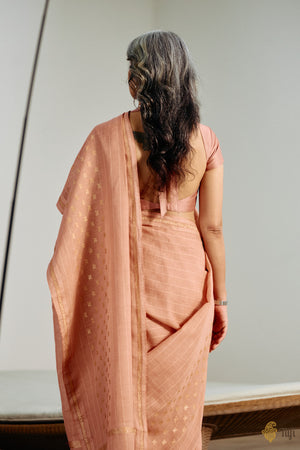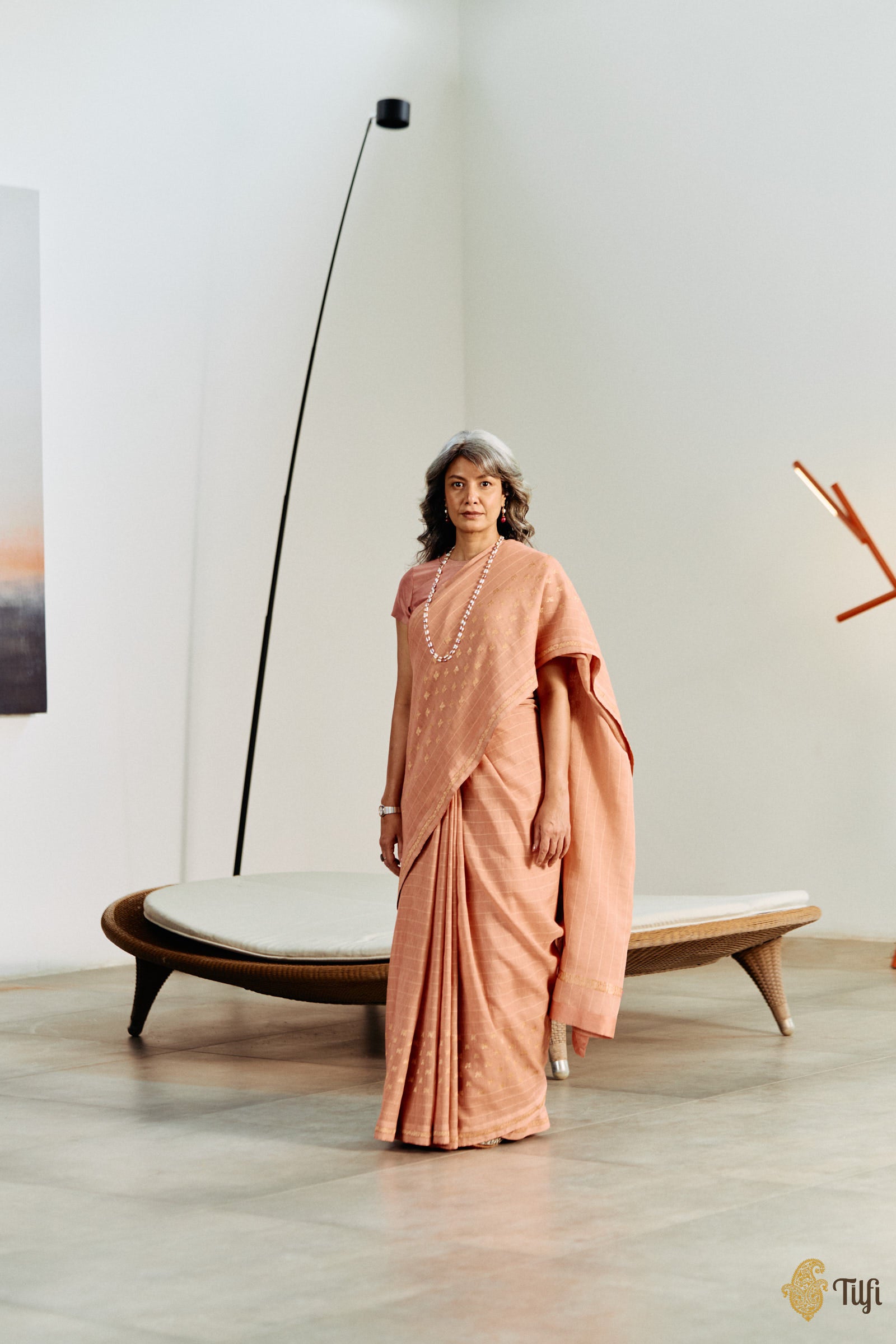 Collection Note - Intersections brings the earthy tactility of cotton-by-linen weaves into dialogue with the language of Banarasi craftsmanship. Stripes, checks, and floral accents emerge with a softened edge, the natural diffusion of linen’s texture tempering the precision of the master weaver’s hand. Tension is finely calibrated to the fibre’s inelastic nature, reed settings adapted to maintain clean patterning, and zari with meenakari is worked in the slow, exacting kadhua technique. Each saree is a study in intersections: of fibre and form, restraint and ornament, personality and pattern.