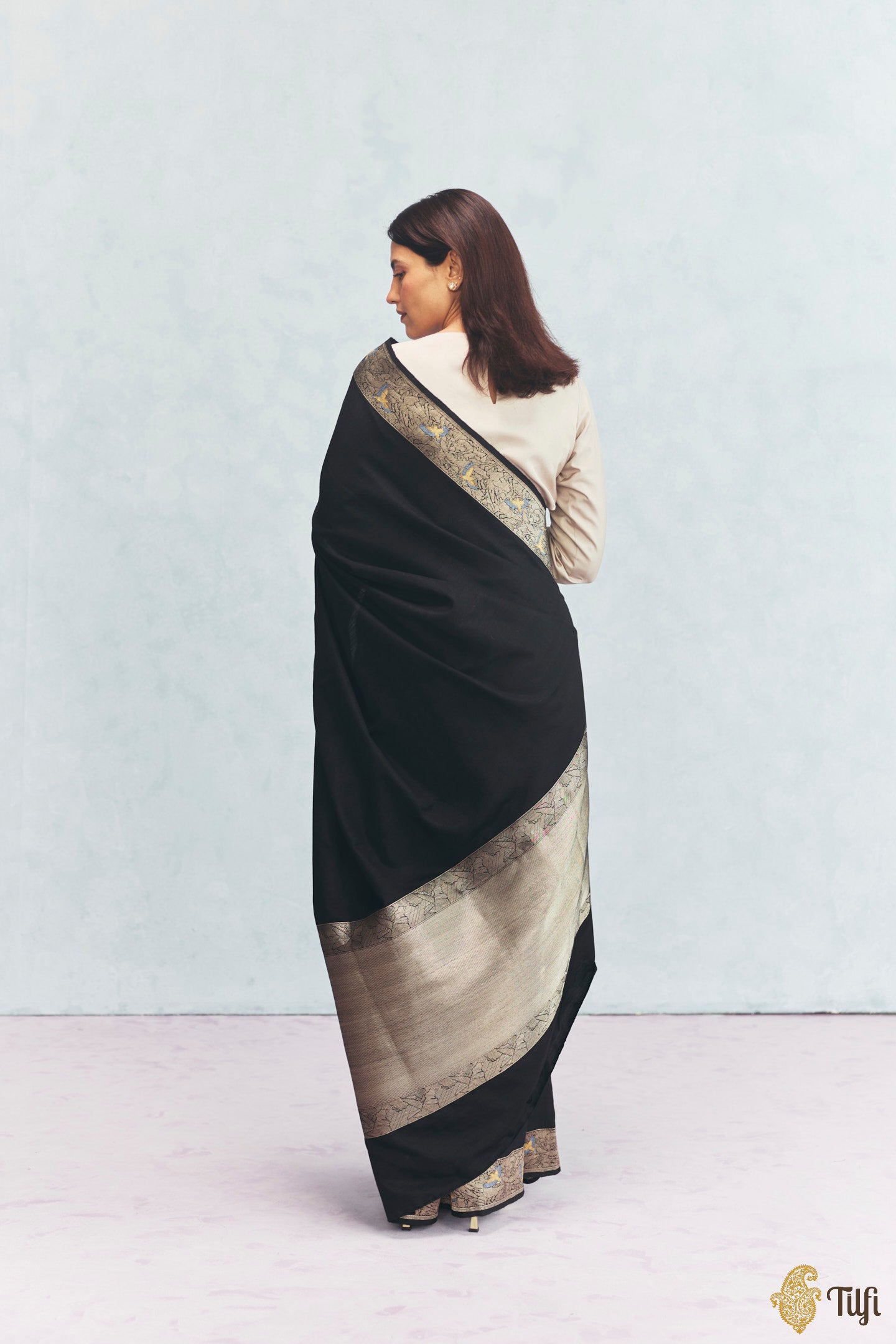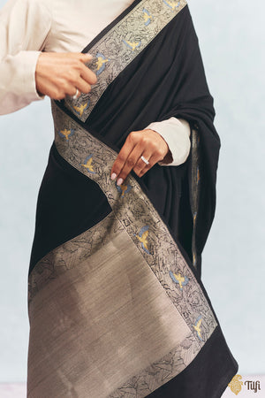 Frostborn is a study in winter minimalism. Woven in Kadhua, its disciplined zari linework borders evoke majestic mountains. Bluebirds, captured mid-flight in meenakari, bring a subtle burst of colour, animating the still landscape. The textured terrains and delicate birds lend movement to the plain-bodied canvas, creating a quiet harmony between the vastness of the space and the fragile creatures that inhabit it.