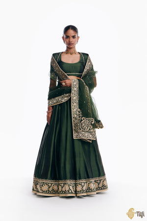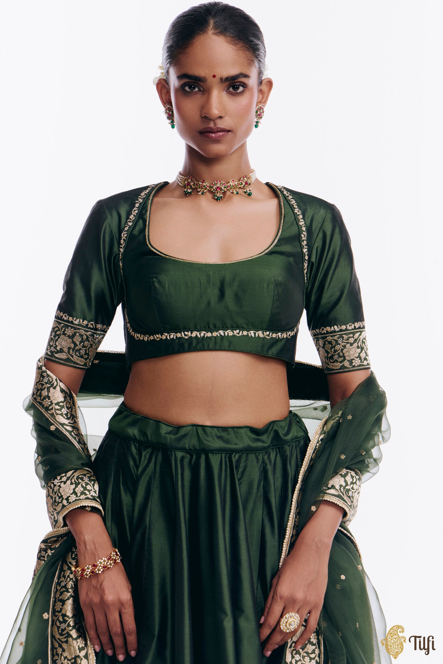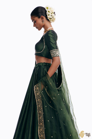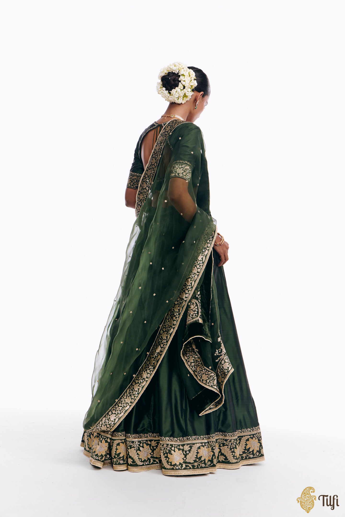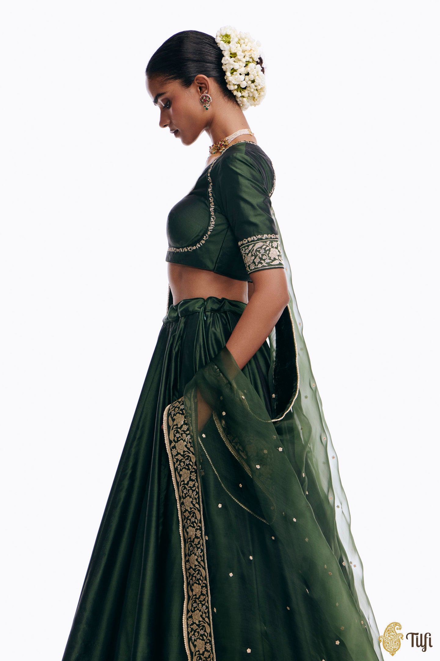The lehenga is paired with a hand-embroidered silk organza dupatta featuring shimmery handwoven borders and velvet facings for a regal touch. An iconic Tilfi paisley adorns one corner, while dainty floral bootis scatter across its body. Complementing it is a Katan silk blouse with hand-embroidered accents that lend grace and structure to the ensemble.