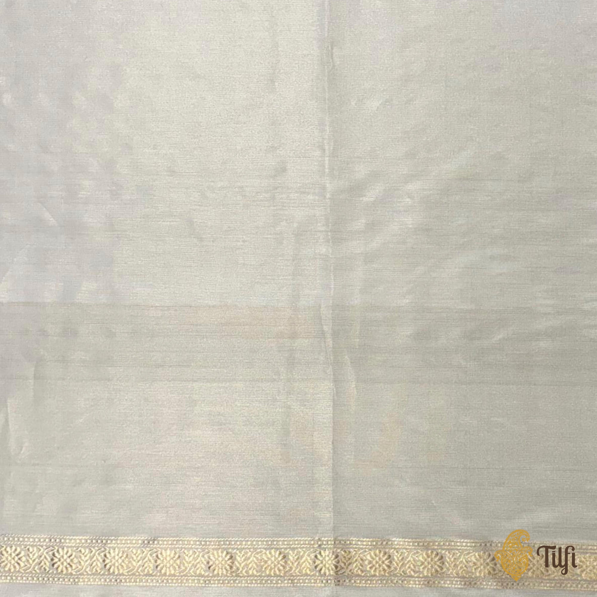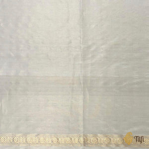 A study in restraint and radiance, this off-white Pure Katan by Tissue saree embodies Banaras at its most refined. The fabric carries a soft luminosity and is unmistakably regal. The saree features finely spaced Kadwa Roopa Sona bootis, individually handwoven using the traditional kadwa technique in silver and gold zari.