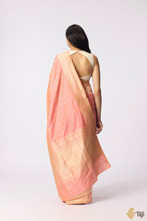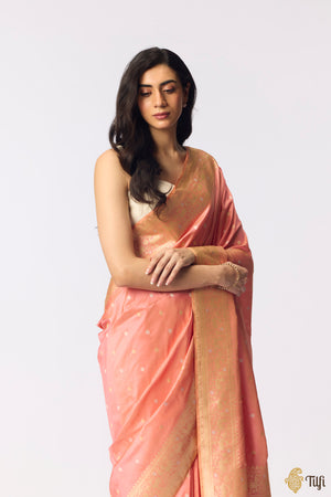 A beautiful bootidaar Shikaargah saree, handwoven with Banarasi expertise on resplendent Katan silk with two tones of zari.