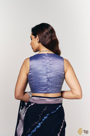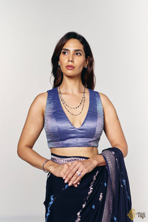 Intricate zari vasket meets the precision of a defined V neckline in an elegant shade of blue. A timeless blouse that elevates every drape.