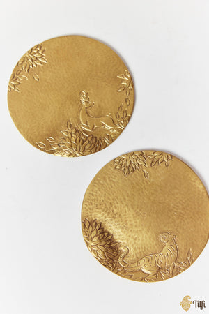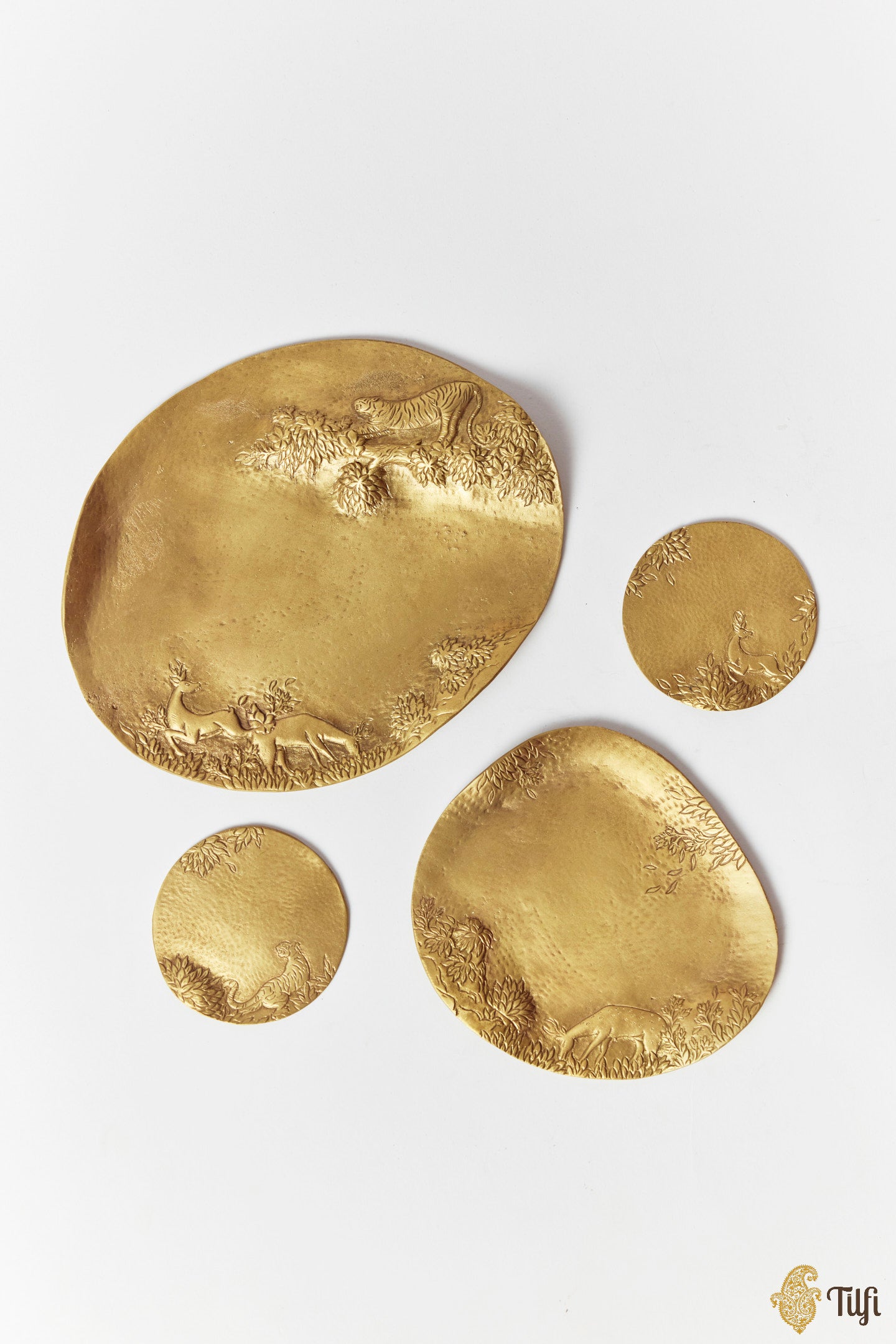 A quiet vignette from the forest, rendered in brass. A set of versatile repoussé trays and coasters depicts spotted deer and tigers amidst foliage. A panorama of the wild unfolds in metal, where creatures leap, stride, and graze, creating an interplay of motion and rest. The terrain rises and dips with an organic rhythm, its undulations shaping both form and function. Delicate and restrained, yet richly alive, these creations hold objects or rest as art.