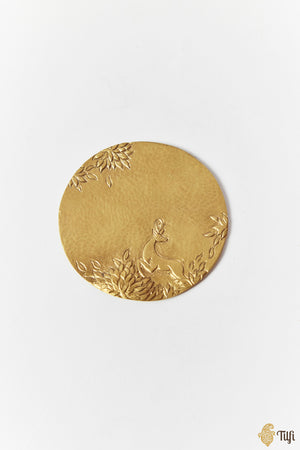 Where mythic hunt scenes meet the modern table. A set of two repoussé brass coasters capturing the leap of a deer and the stride of a tiger amidst foliage. Strategic undulations evoke the lay of the land while allowing the coasters to stack and sit flush. A marriage of utility and storytelling, these coasters bring the Shikargah alive in the everyday.