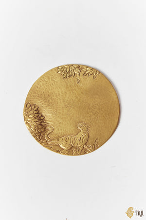 • Collection Note-Rooted in the storied vocabulary of Banarasi textiles, Tilfi’s Shikargah collection of Art & Collectibles finds new expression in hand-crafted brass. Each object is shaped using age-old handcraft techniques, including Banarasi metal repoussage. Scenes of tigers, deer, birds, and foliage unfold across the surface, beyond ornamentation as a thoughtful play between form and function. Undulating planes recall the terrain of the wild, while flatter surfaces lend themselves to utility. These creations live at the confluence of art, craft, and design: singular objects of beauty and purpose, marked by Tilfi’s sensibility of inheritance and reinvention.