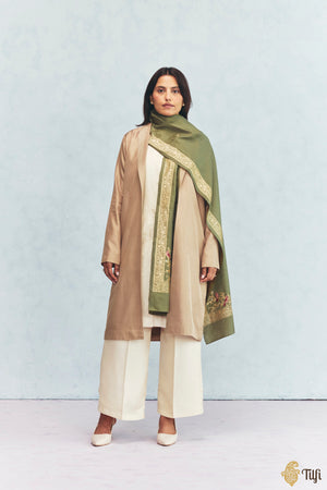 A winter classic, Willow features a border of zari floral vines and bootis scattered across its canvas, textured with gentle frost. Bright red Northern Cardinals rest on slender branches at the koniya, their muted gold-zari petals offer a quiet contrast to the vivid birds. A study in restraint and detail, it is an unmistakably Banarasi shawl, shaped with purpose.