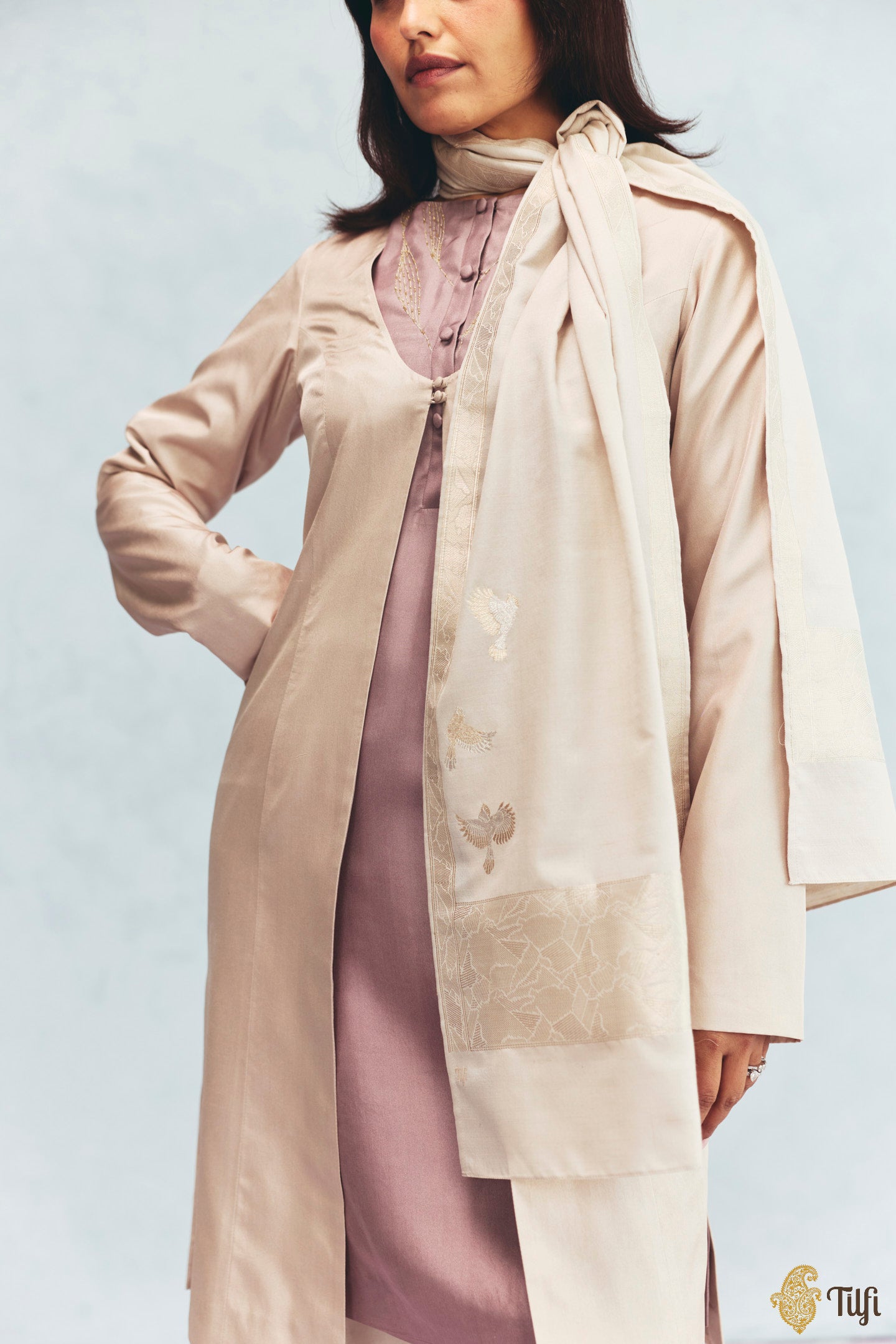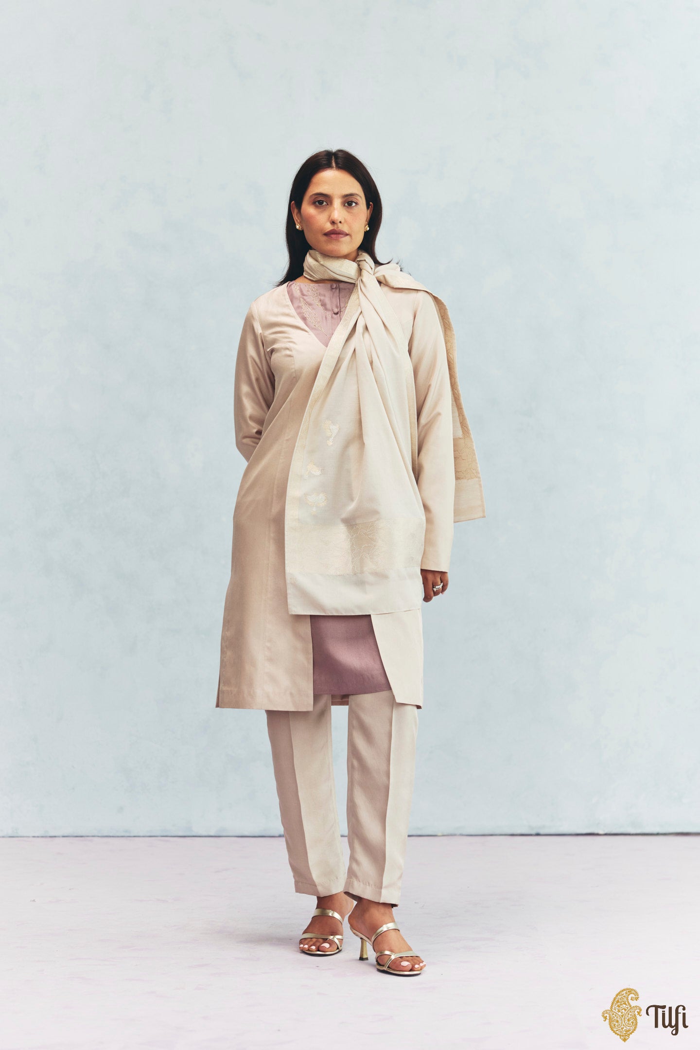 - Collection Note: Tilfi’s Silk Wool collection extends Banarasi into new material terrain, evoking the hush of frost-kissed branches, the flight of birds across open skies, and the gentle geometry of snow-laden landscapes. Woven with the finest Pashmina yarn and pure silk, the textile finds a poised balance between softness and structure. Through meticulous Kadhua craftsmanship, the collection becomes a study in muted winter minimalism, where tradition evolves by deliberate design. Composed in subtle contrasts, its narrative is defined as much by absence and stillness as by abundance and vibrancy.