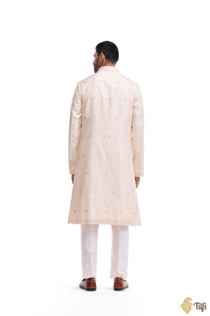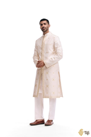 An off-white pure Katan silk sherwani woven in enduring Kadhua technique featuring meenakari bootas across its body. It is paired with an off-white hand-embroidered silk cotton kurta set and an organza dupatta in zari and aari embroidery.