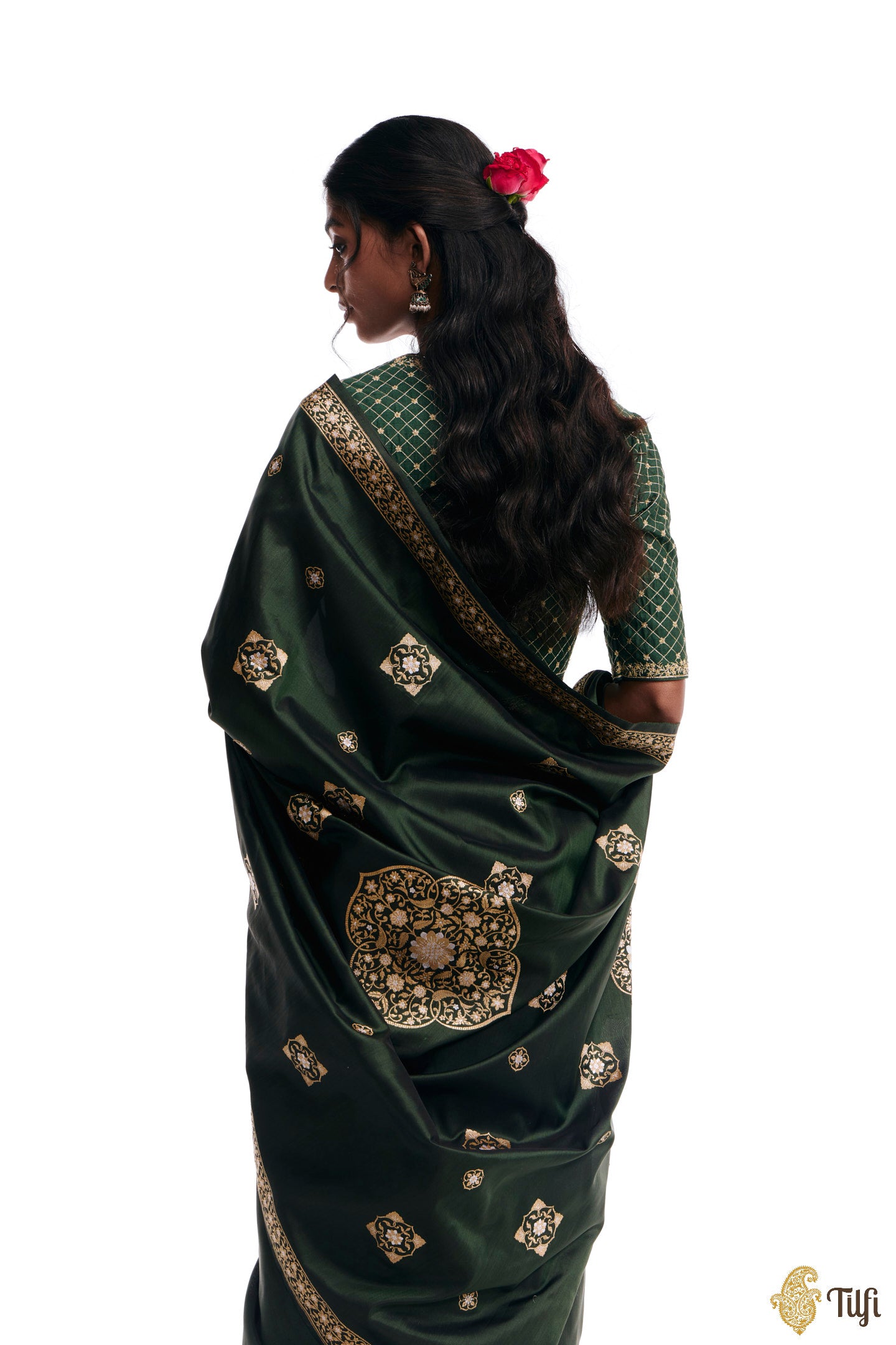 Delicate floral vines, woven in precise geometry, unfurl along the borders, while graceful chaufuliya blooms adorn the body. Crafted in exacting kadhua with roopa sona zari, the pallu reveals a discipline of symmetry refined through centuries of design heritage. Sculptural geometric bootas are thoughtfully placed, each form oriented toward a striking quarterfoil medallion. A rare distribution and directionality drawing the eye inward, a quiet homage to the architectural poetry and ornamental mastery of Deccan ateliers and Banaras.