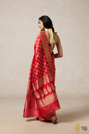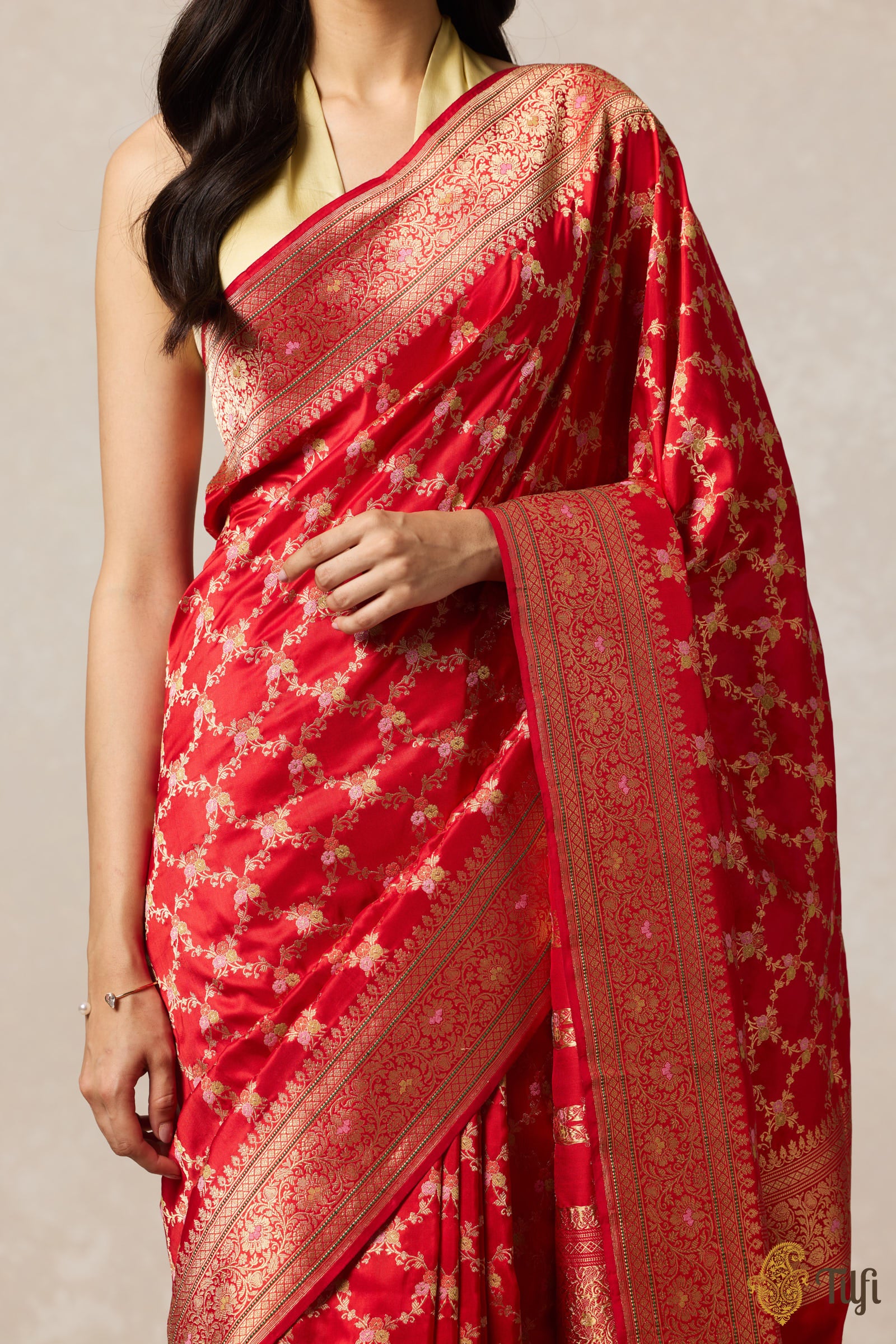 A red Katan silk Banarasi handloom classic with a beautiful, time-honoured floral Kadhua Meenakari jangla, and an intricately designed pallu of perfectly crafted cypress motifs with floral arrangements in glistening zari and lightly pigmented resham.