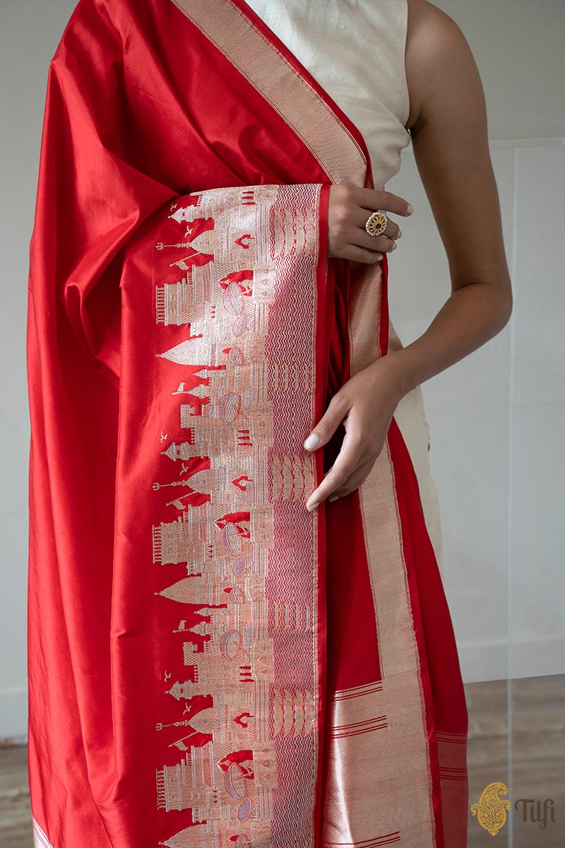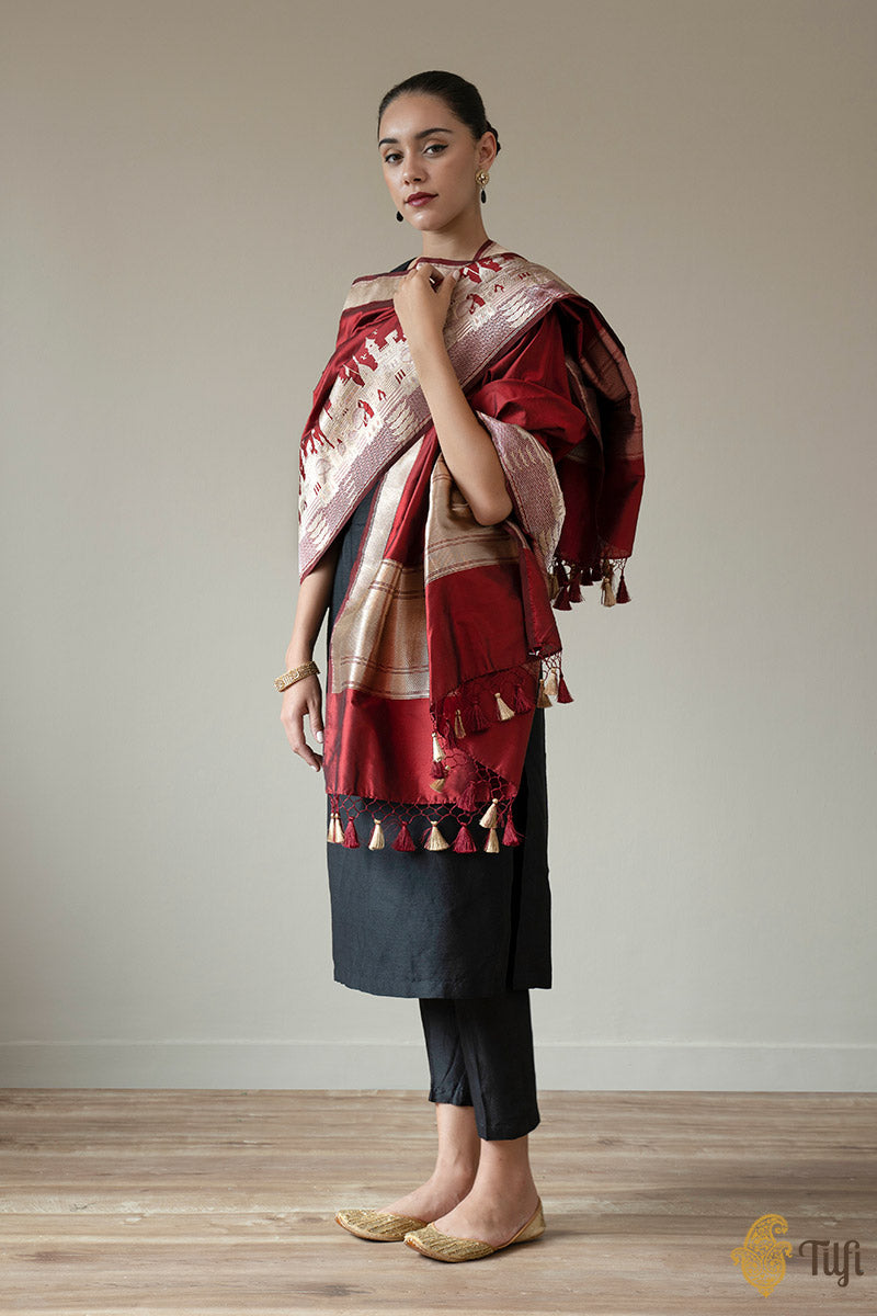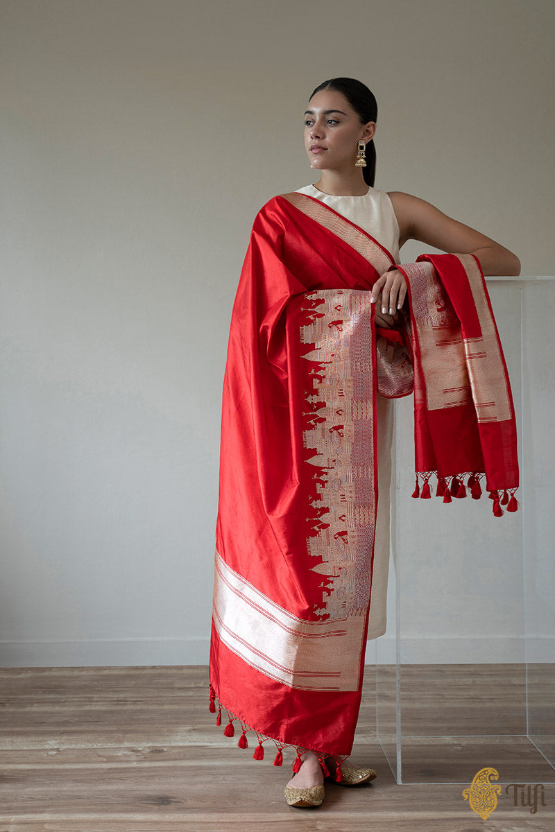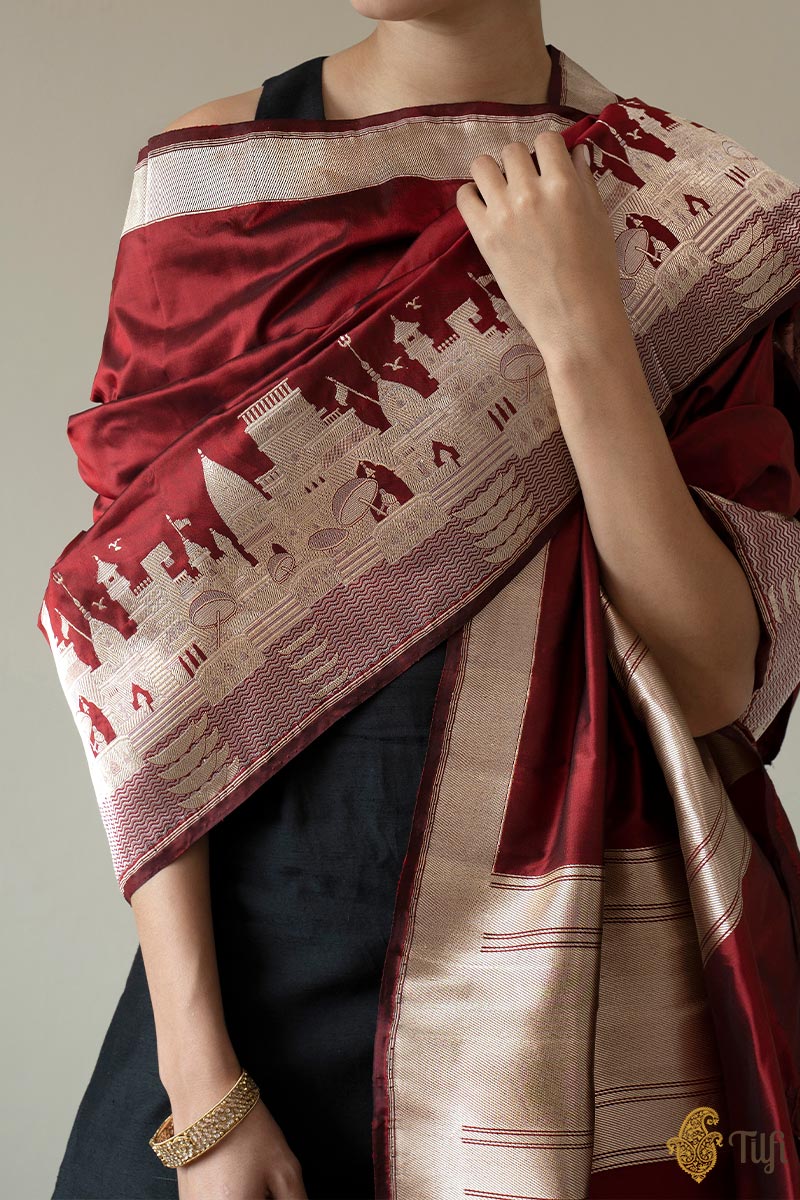 The glorious outline of Varanasi's Ghats, lovingly handwoven on a base of resplendent silk. Incredible in its details and a mirror to the splendour of Banaras as seen from the river Ganga.