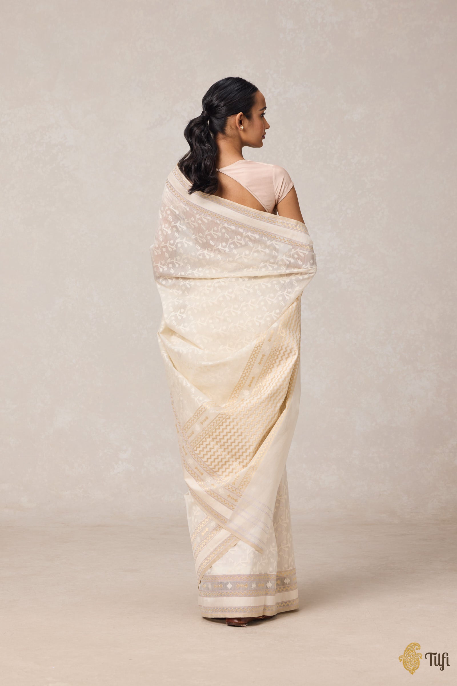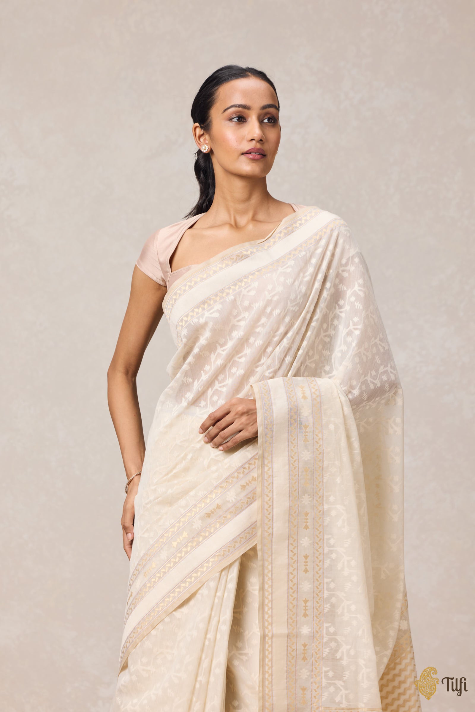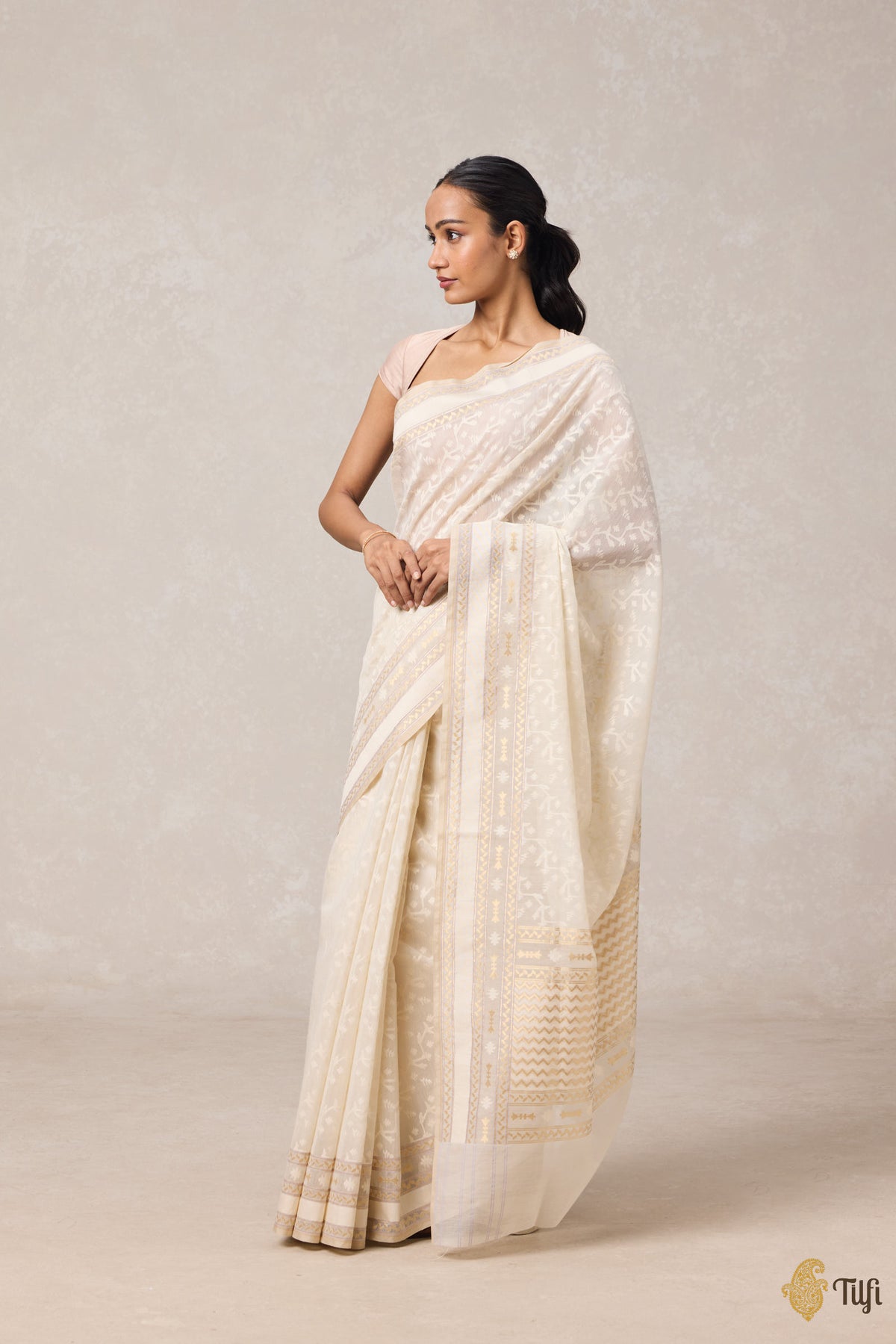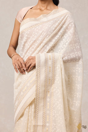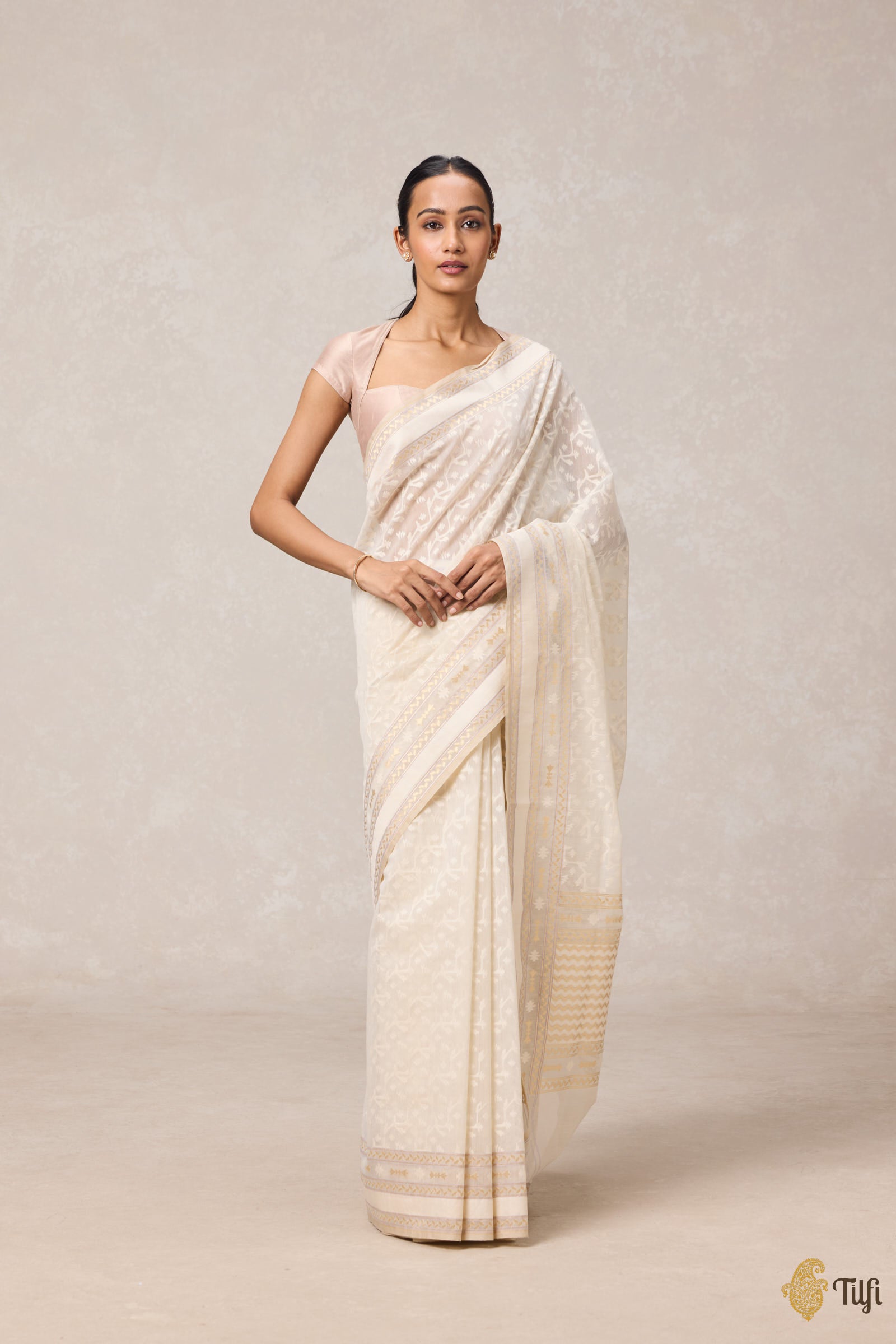 An effortlessly elegant saree with an understated resham cutwork jaal. Adorned with floral vines and motifs with a distinctive geometric signature, highlighted with subtle accents of zari.