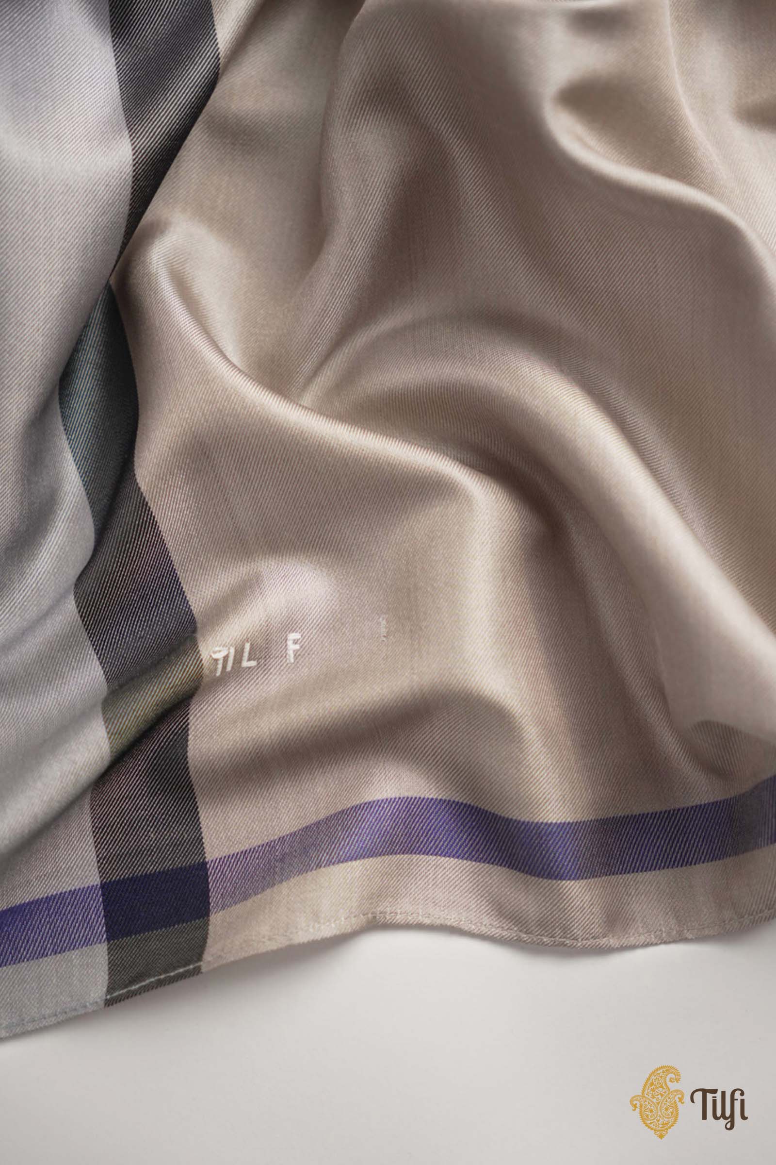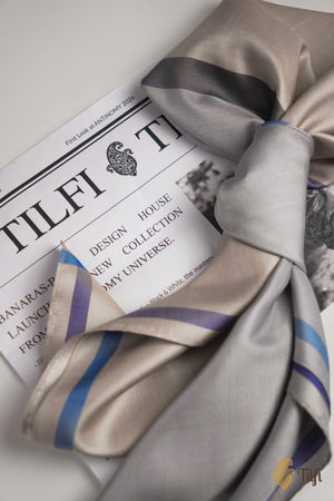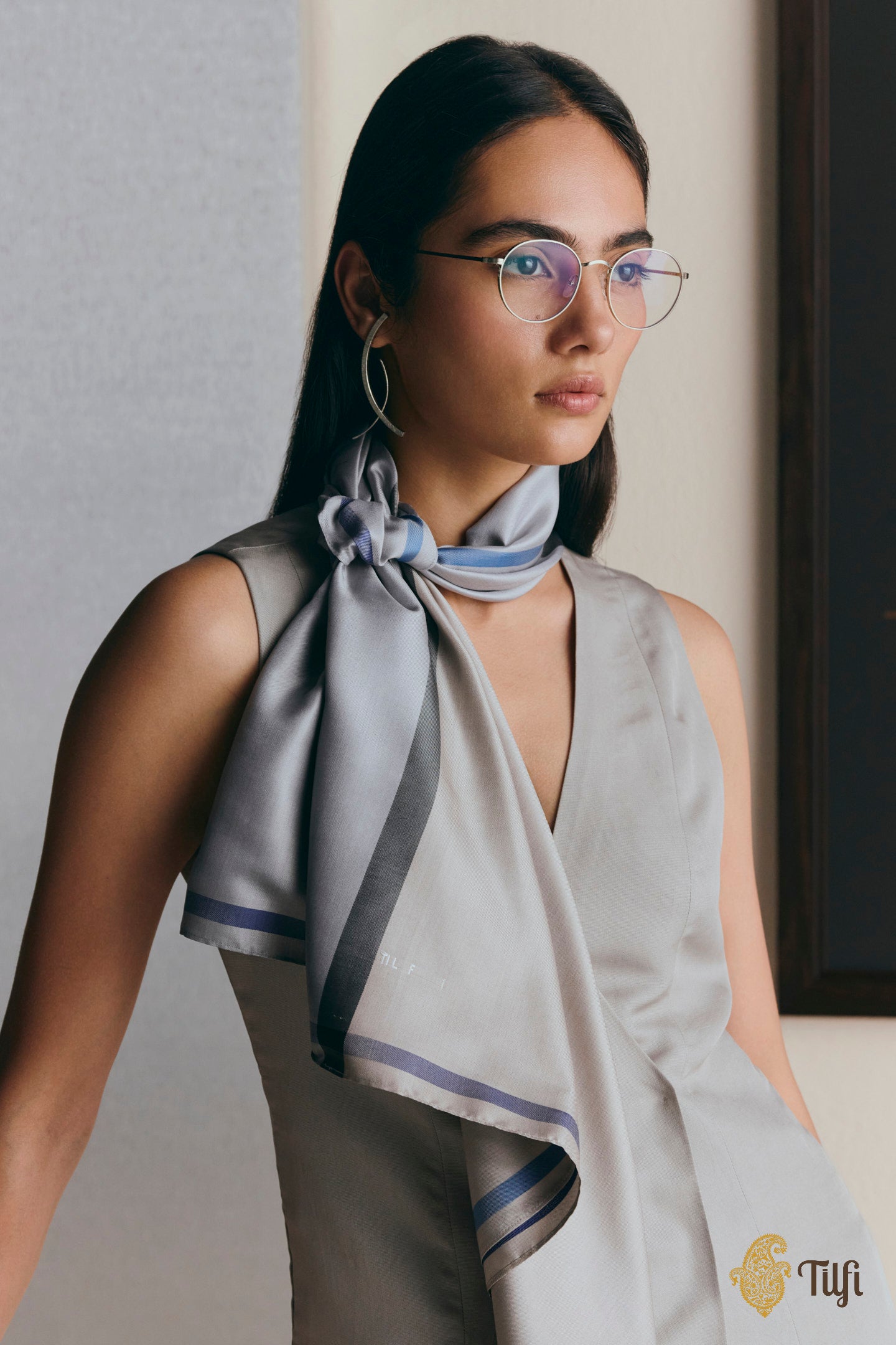 A soft off-white composition meets a grey panel in a clean, colour-blocked layout,  framed by linear borders in tonal neutrals. Accents of blue trace the edges, while a subtle dark band adds definition to the scarf. Crafted in silk twill, it offers a smooth finish and fluid drape.