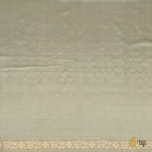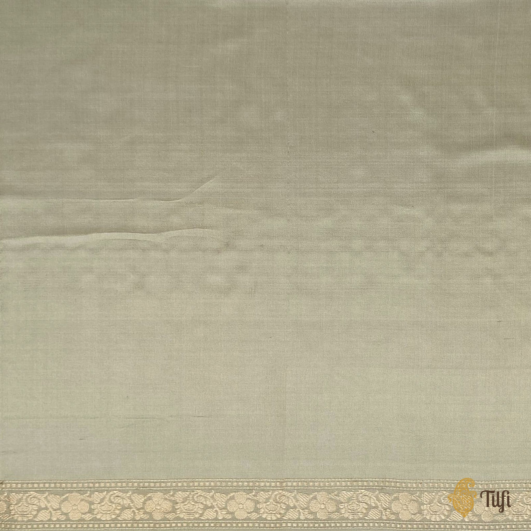A classic Katan silk saree adorned with sleek Kadhua bootis and an aadha (diagonal) jangla pattern. Edged with a striking floral border with precisely curved vines crafted in roopa sona zari.