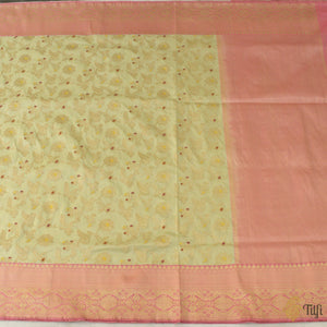 This gorgeous saree with its vintage Banarasi inspirations and exquisite kadwa weave can be handed down through generations! A quintessential kadhua jangla with elaborate use of zari, dainty touches of meenakari and a beautiful kadiyal border - classic Banarasi opulence!