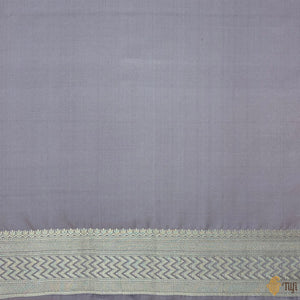 An old rose pure satin silk Banarasi saree with a geometric pattern of triangles positioned in alternating trios throughout the body. Finished with a gold zari border and pallu in a zig zag pattern.